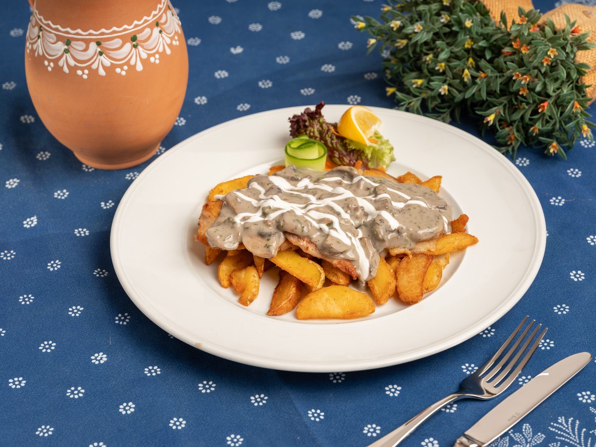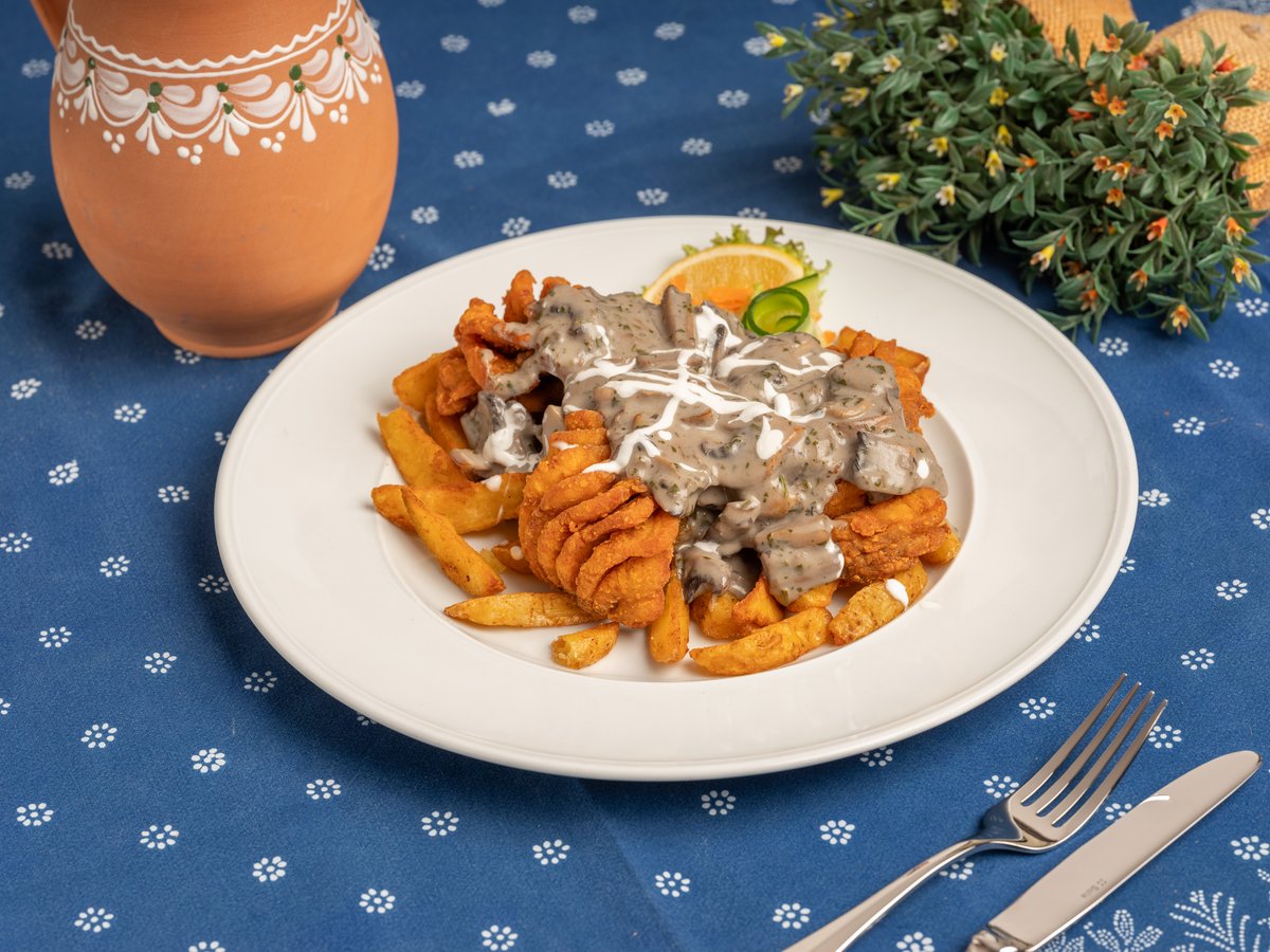 Paprikás lisztbe forgatott filézett pontyszeletek tejfölös gombamártással borítva (Köretet nem tartalmaz.)/Carp fillets coated with paprika seasoned flour , covered with mushroom sauce (Does not include garnish)
