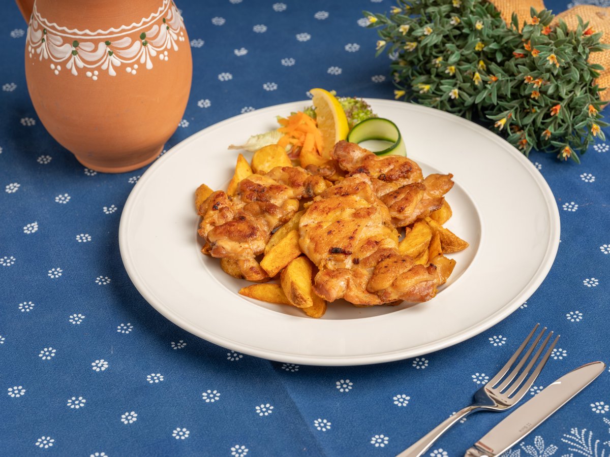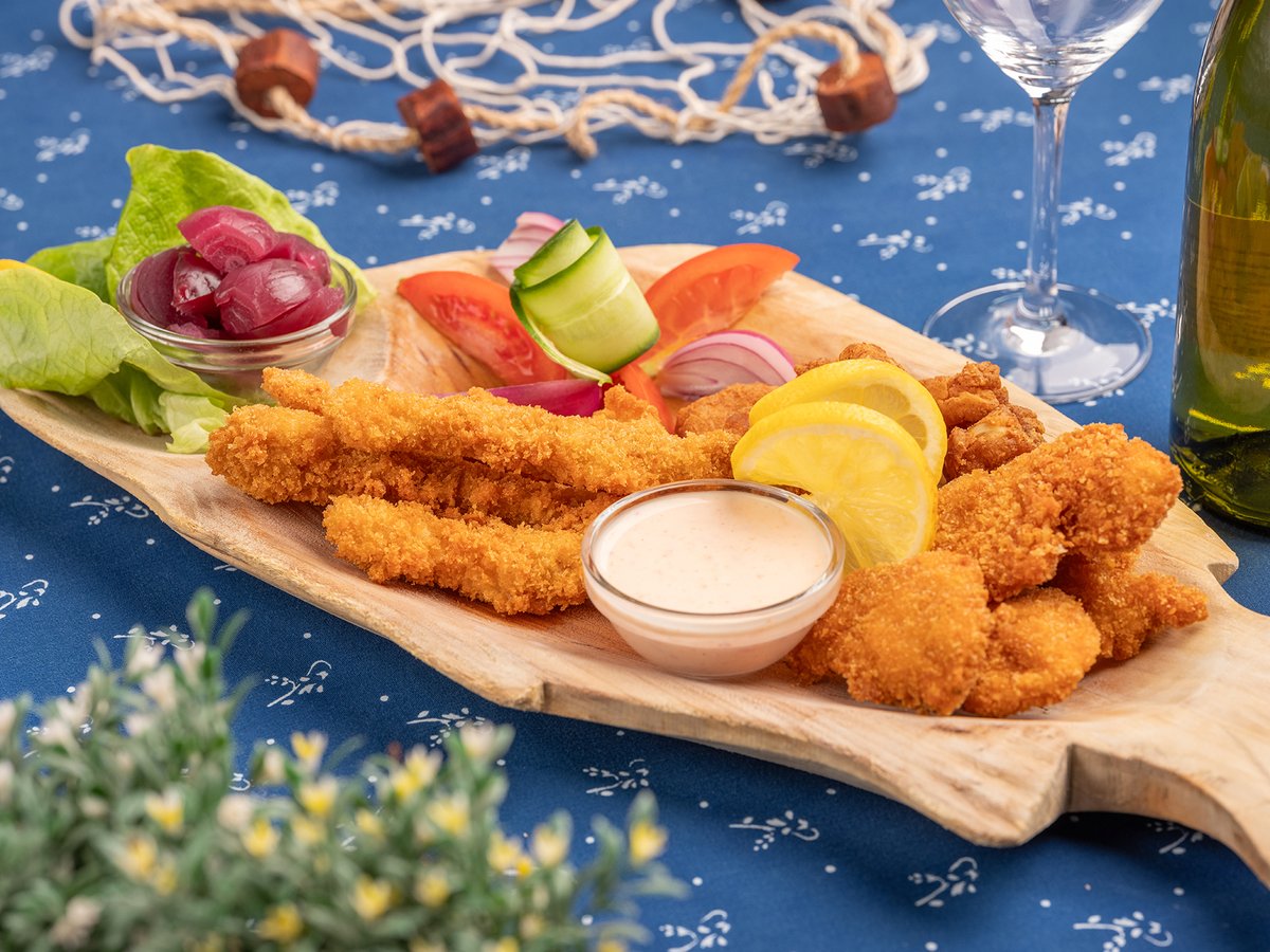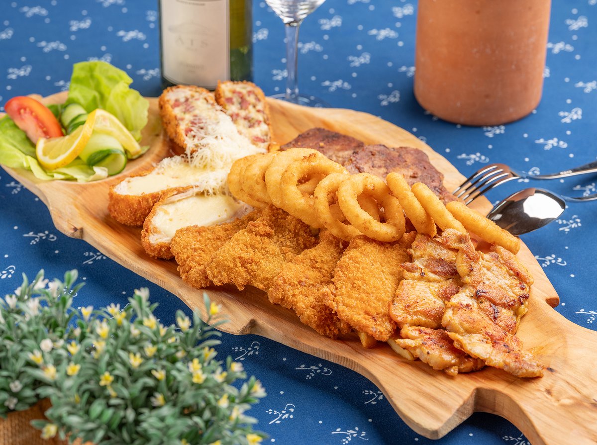 (kétszemélyes) sajttal töltött pulykamell rántva, szögedi roppanós halfalatok, szegedi töltött szelet (csemegeuborka, szalámi, sajt), roston csirkecombfilé, tarja, rántott hagymakarika /Köretet nem tartalmaz./