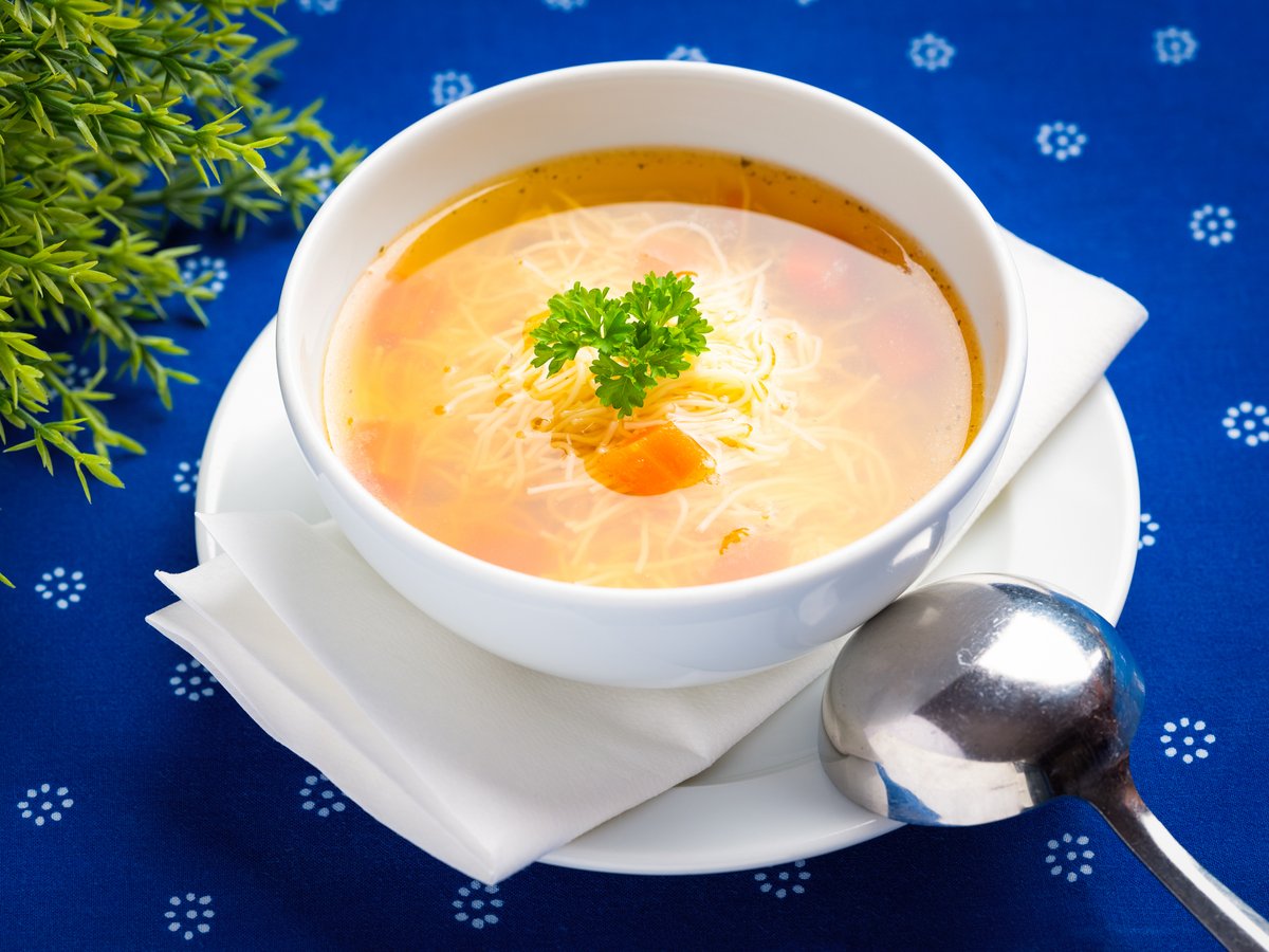 Az alaplé tartalmaz répát, gyökeret, valamint cérnametélt./The stock includes carrot, turnip and with vermicelli