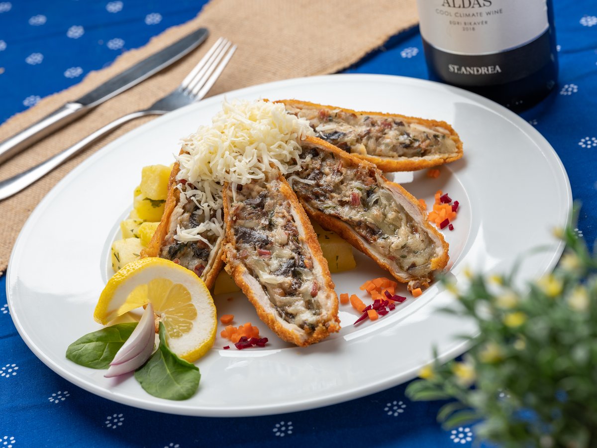 Sajttal, gombával, sonkával töltött pulykamell rántva