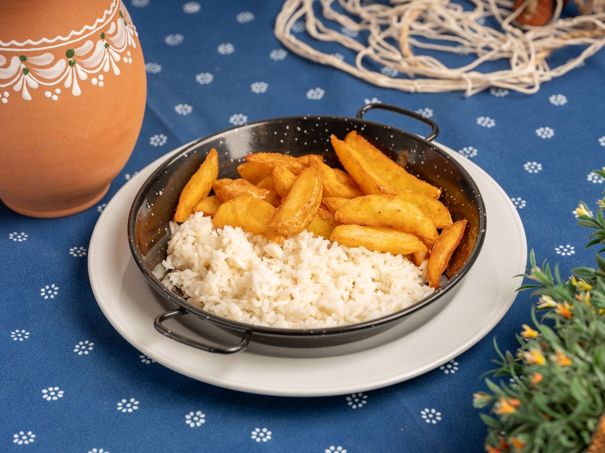 Harcsafilé csíkok lisztbe forgatva, sült burgonyával, fokhagymával összeforgatva/Stripped catfish fillet coated with paprika seasoned flour,french fries with garlic