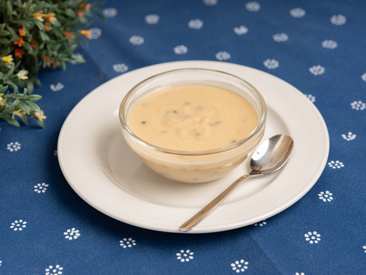 A leves tejszínes, valamint répát, borsót, fehér répát, csigatésztát és csirkemellet tartalmaz./The soup contains carrots, peas, turnip, dumplings and chicken.