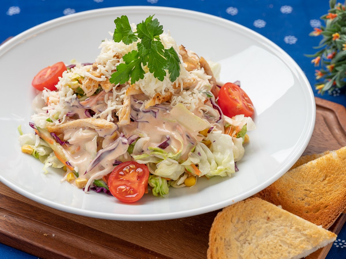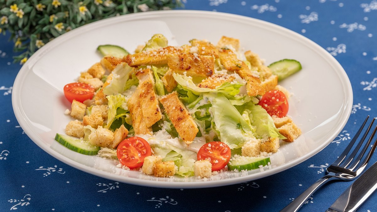 (vegyes zöldsaláta roston csirkemell csíkok vagy roston harcsa szelet, salátaöntet, parmezán, crouton)