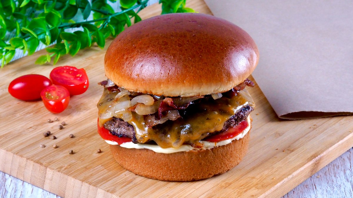 18dkg Black Angus szárazérlelt marhahús, ketchup, amerikai sárga mustár, uborka relish, fokhagymás mayo, dupla cheddar, bacon, karamellizált hagyma