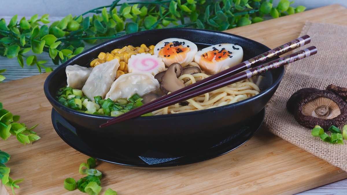 Japán ramen leves tojással, kevesebb ramen tésztával, újhagymával, shiitake gombával, kukoricával, választható hússal és zöldséges gyozával