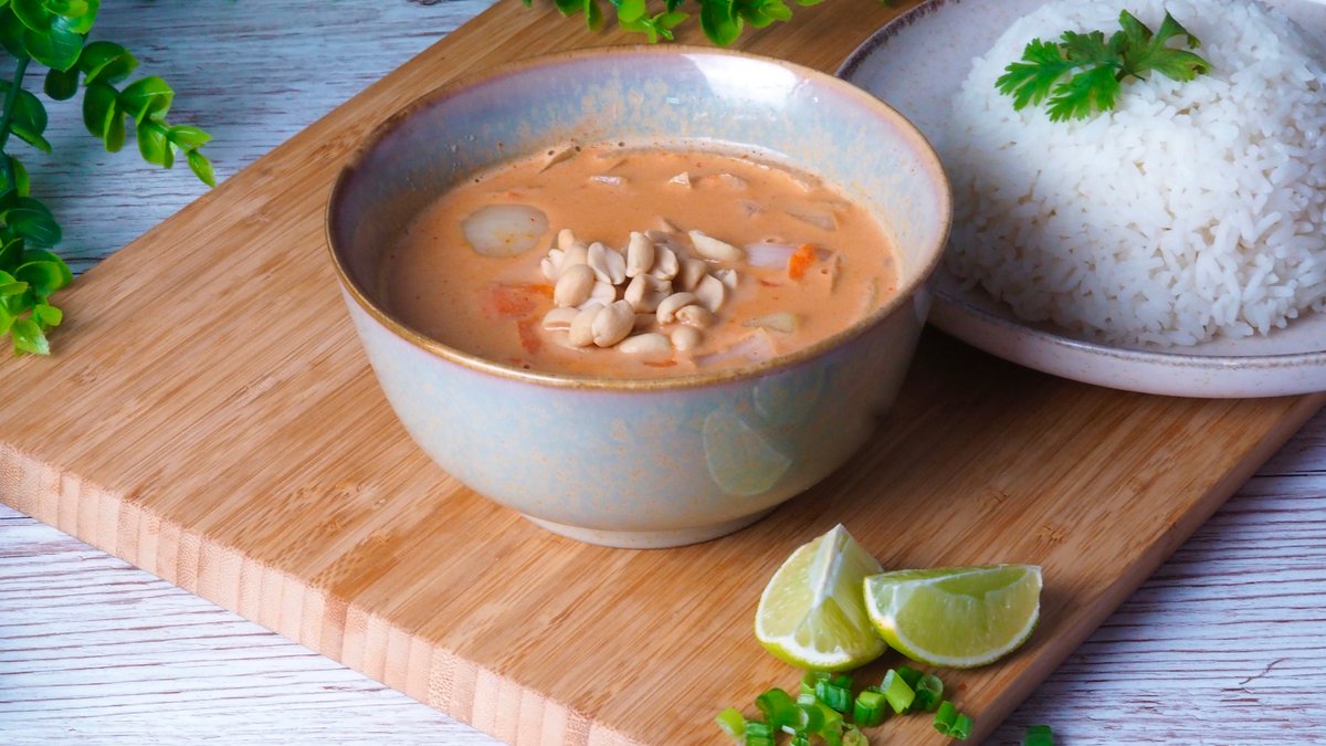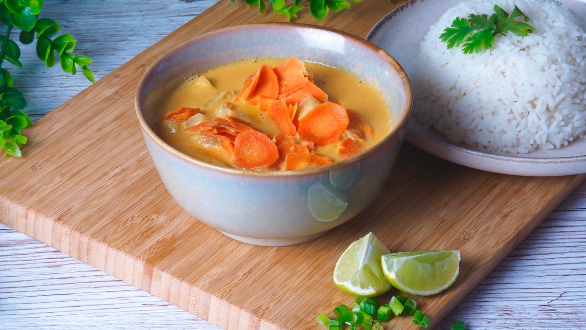 Krémes thai kókusztejes curry főtt burgonyával, mogyoróval, répával és hagymával - nem csípős