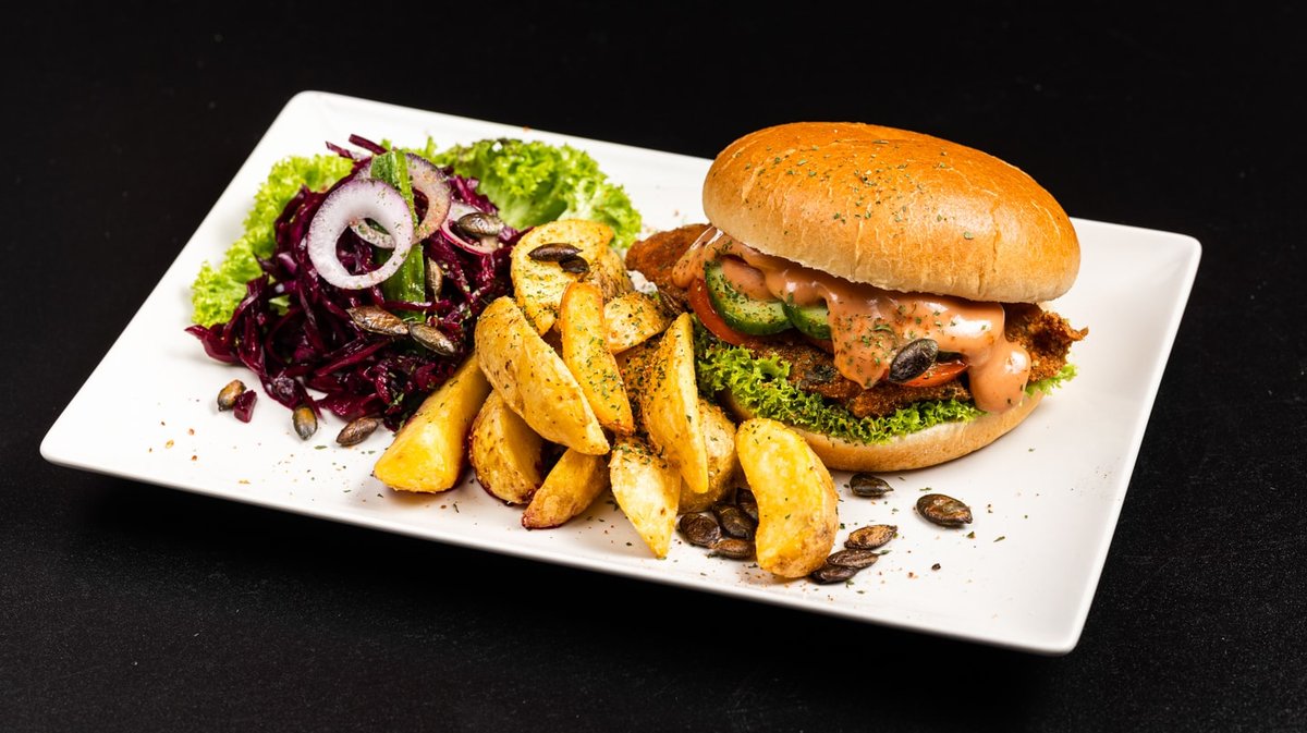 szezámos buci, rántott csirkemellfilé, saláta, uborka, paradicsom, koktélszósz
