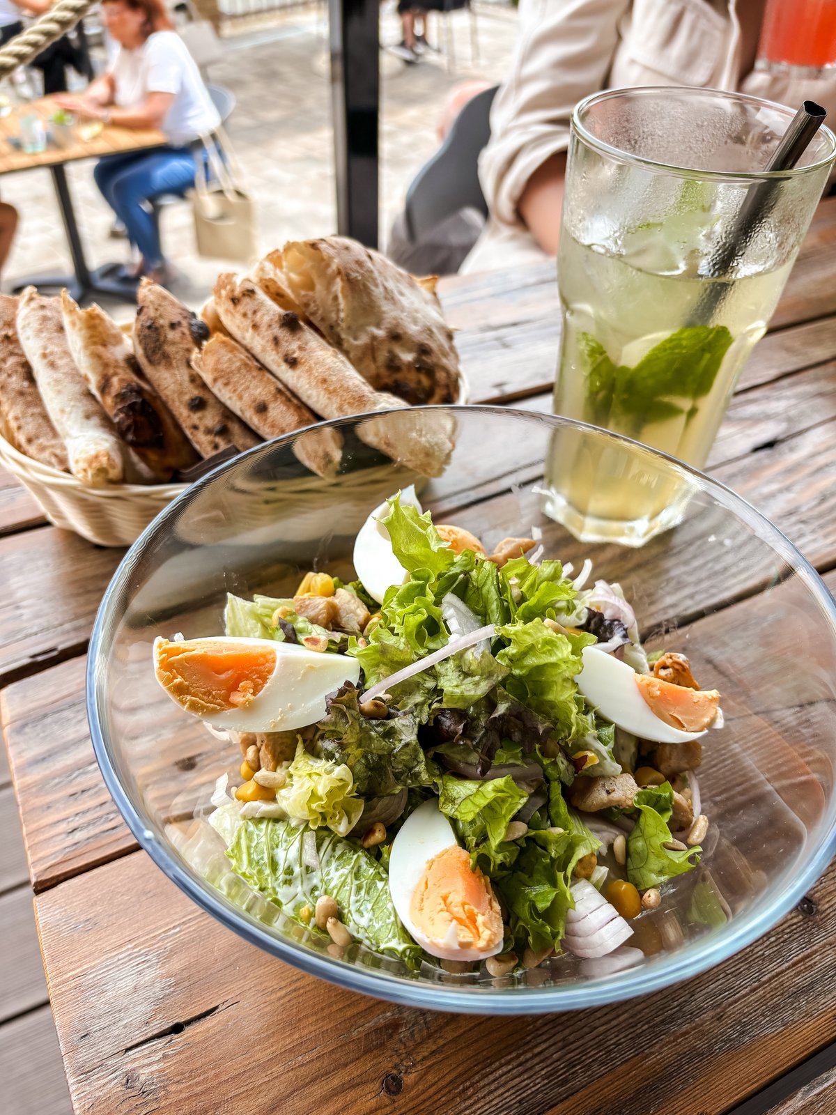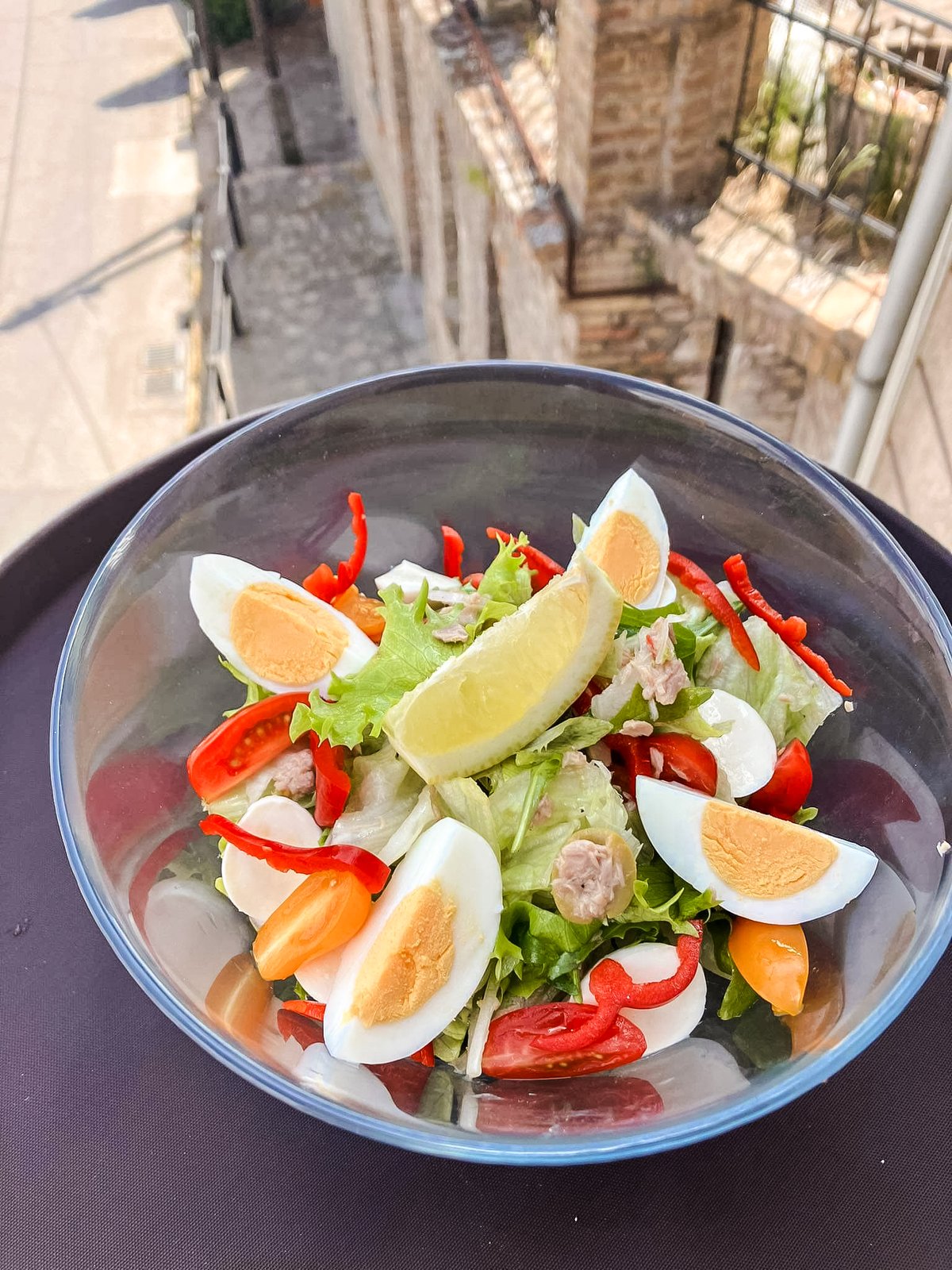 focaccia, saláta mix, tonhal, lilahagyma, koktélparadicsom, főtt tojás, olívabogyó, mozzarella golyó, citromos marinád