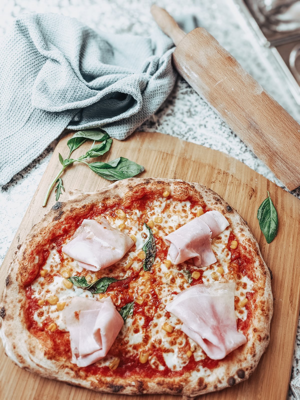 San Marzano D.O.P paradicsomos alap, mozzarella, parmezán, olíva olaj, bazsalikom, cotto sonka, kukorica