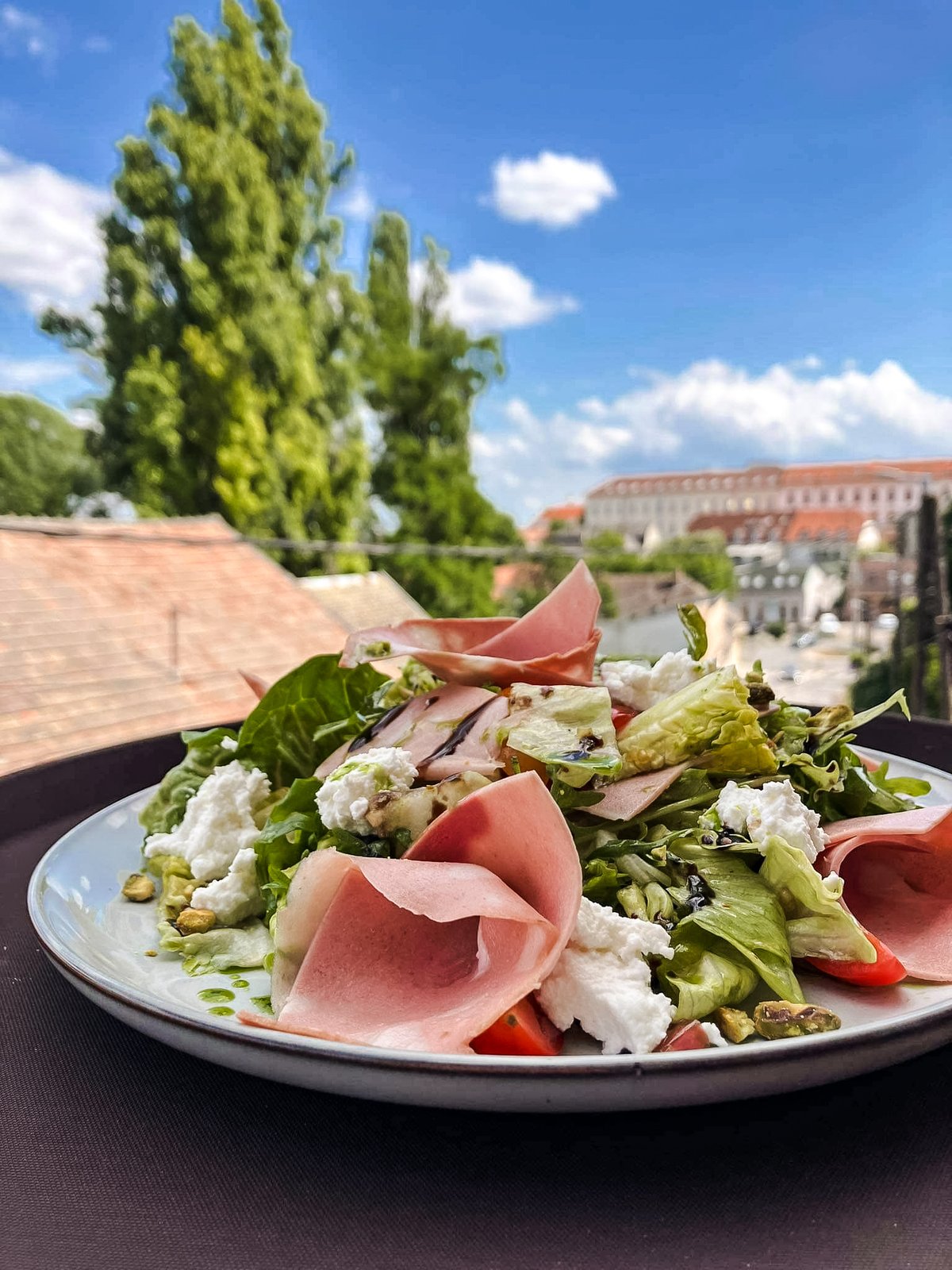 foccacia, mortadella, saláta mix, ruccola, ricotta, pisztácia őrlemény, koktélparadicsom, balzsamecetes dressing