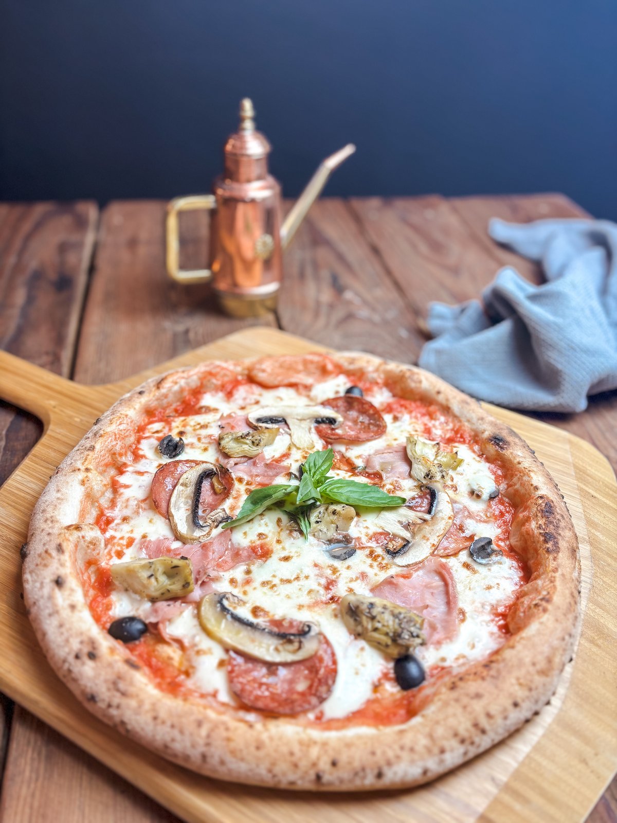 San Marzano D.O.P. paradicsomos alap, fior di latte mozzarella, parmezán, csípős szalámi, kapribogyó, fekete olívabogyó, marinált articsóka, bazsalikom, olívaolaj