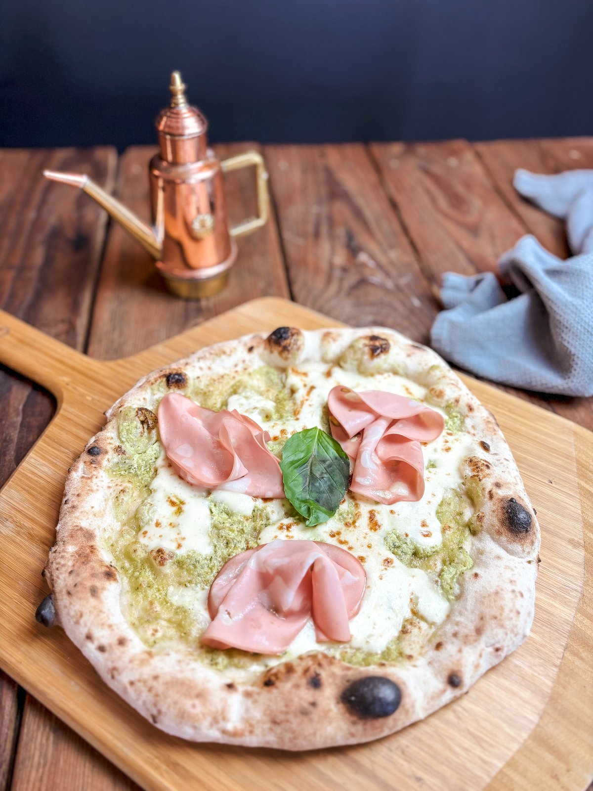San Marzano D.O.P paradicsomos alap, mozzarella, parmezán, olíva olaj, bazsalikom, prosciutto sonka