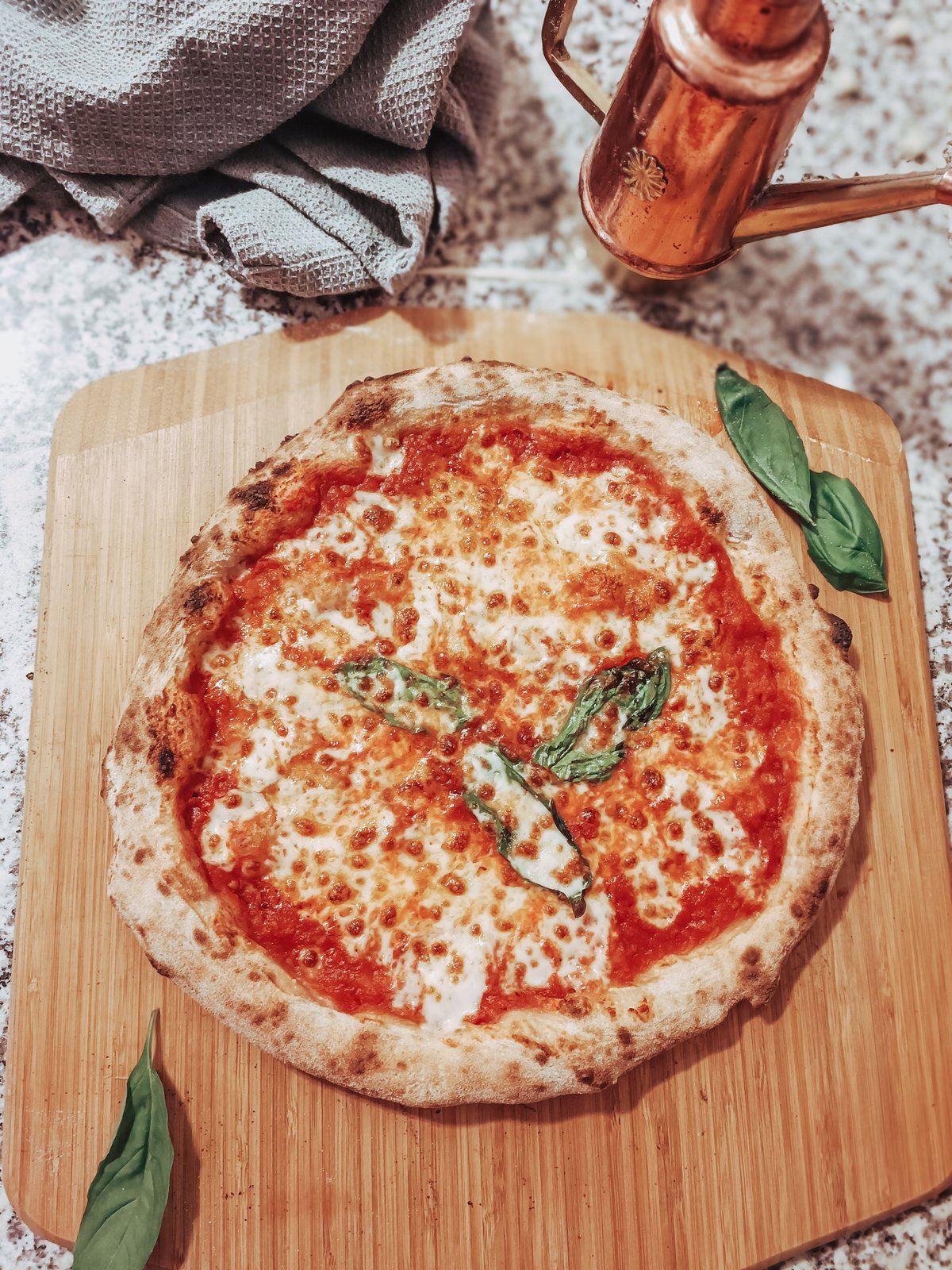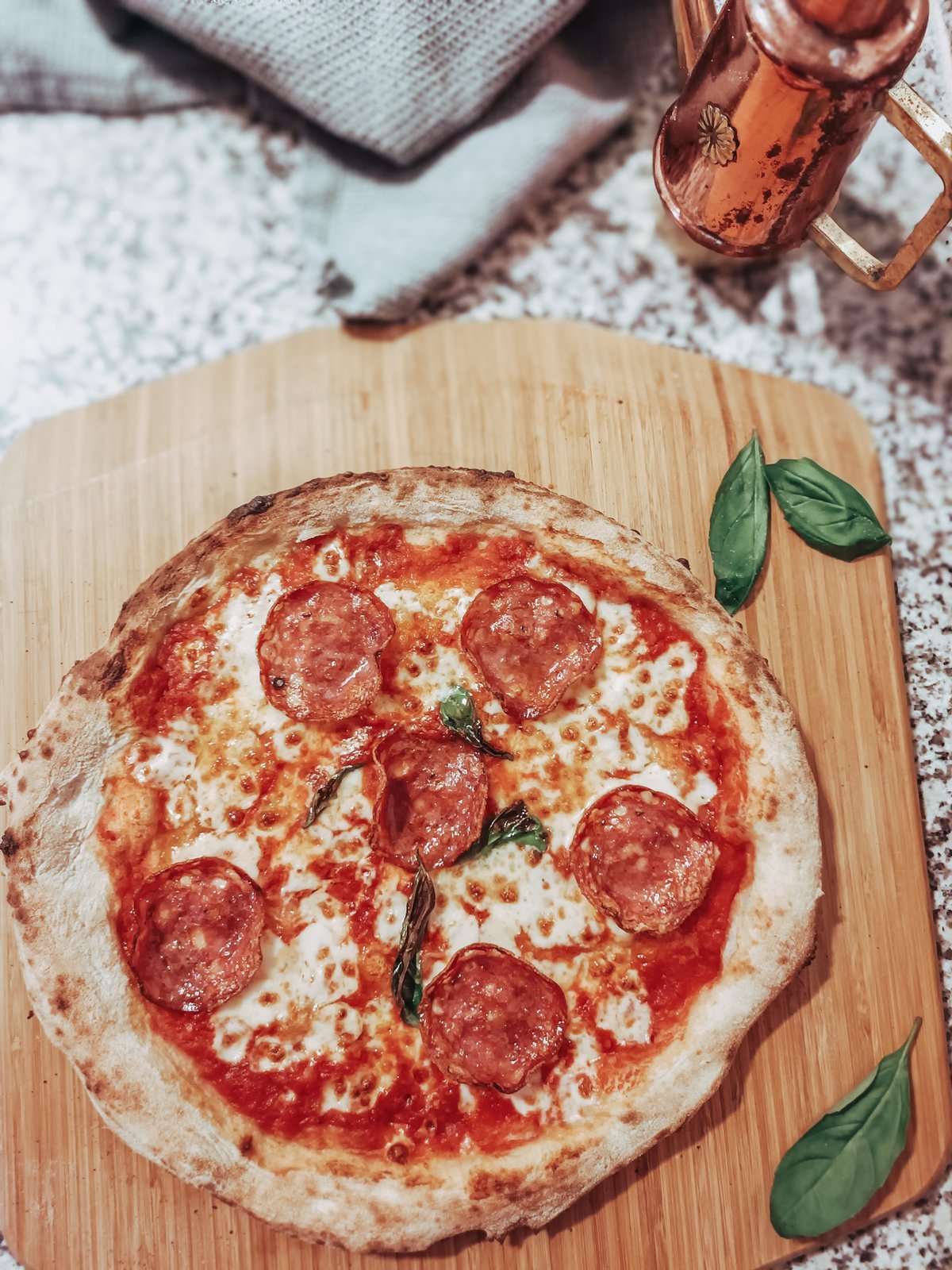 San Marzano D.O.P paradicsomos alap, mozzarella, parmezán, olíva olaj, bazsalikom, csípős szalámi, pepperoni