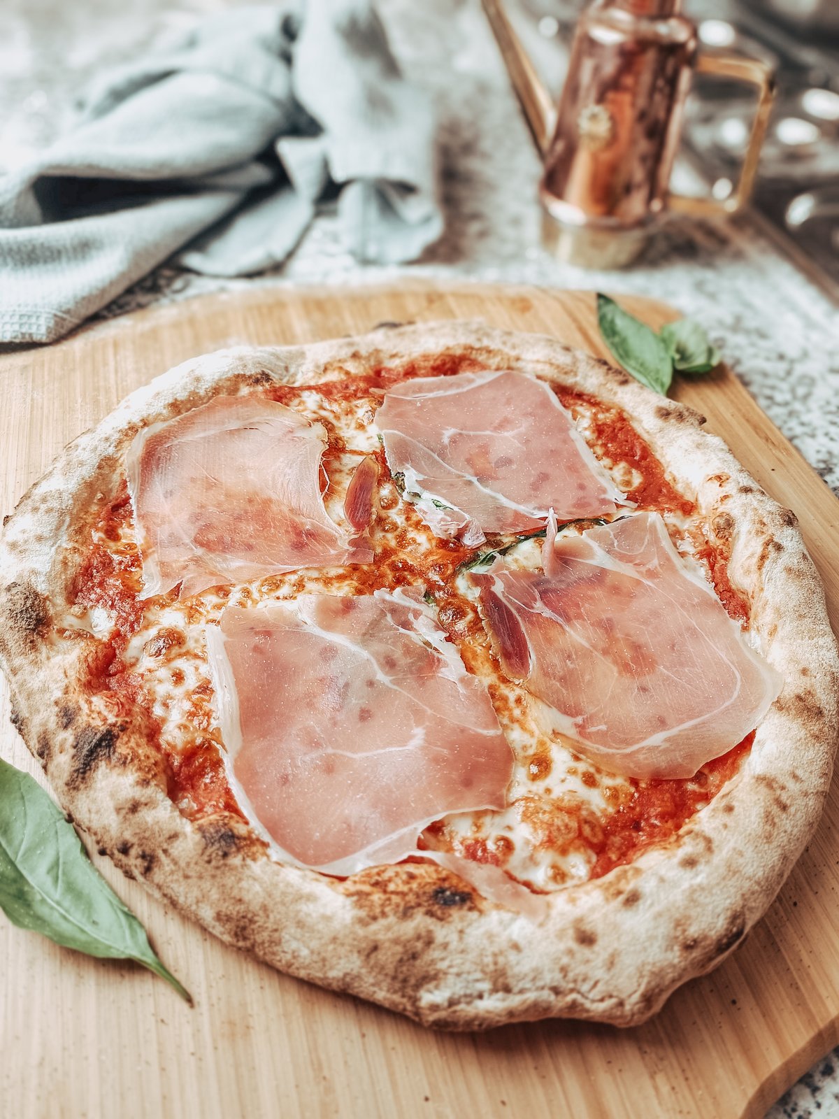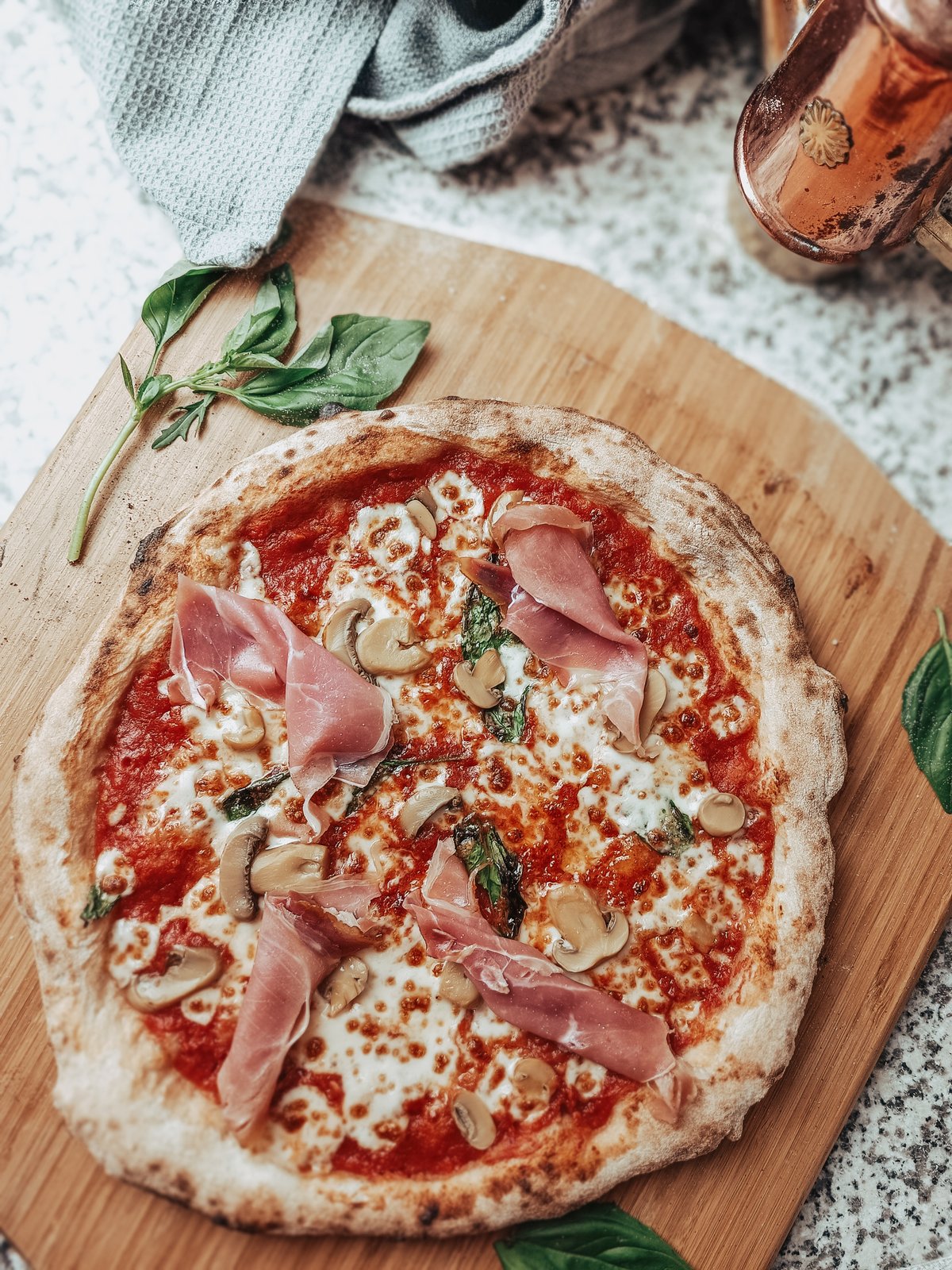 San Marzano D.O.P paradicsomos alap, mozzarella, parmezán, olíva olaj, bazsalikom, prosciutto sonka, gomba