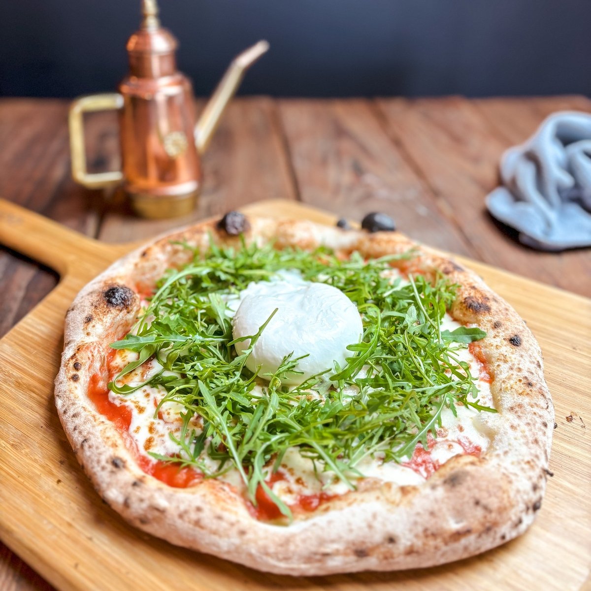 San Marzano D.O.P paradicsomos alap, mozzarella, parmezán, olíva olaj, bazsalikom, burrata, ruccola