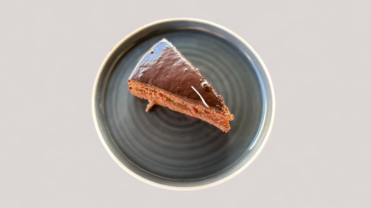 Csokoládés tortaszelet, baracklekvárral töltve.