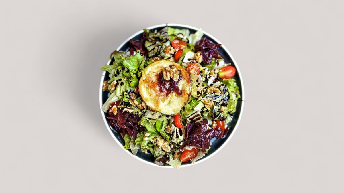 Saláta mix, grillezett kecskesajt, karamellizált lilahagyma, koktélparadicsom, dió, balzsamecetes dressing