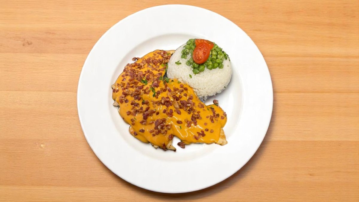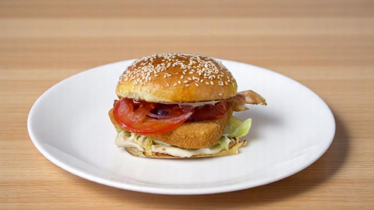 házi fokhagymás majonéz, saláta, hagyma, paradicsom, rántott csirkemell, cheddar sajt, bacon, házi buci