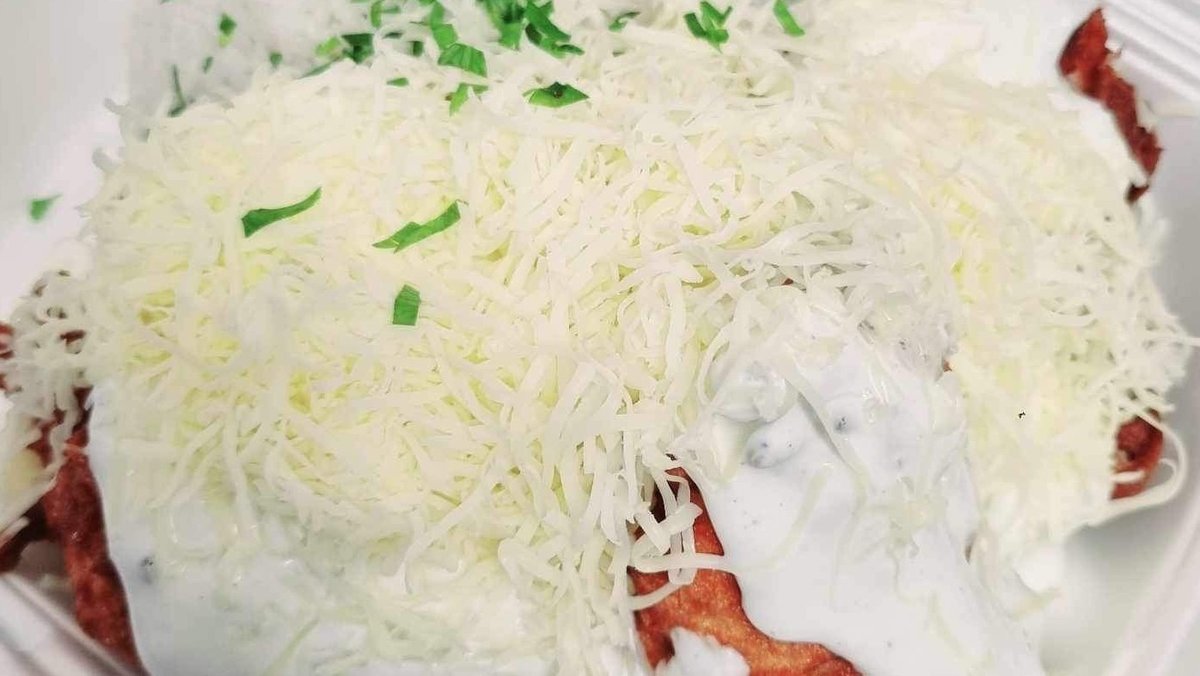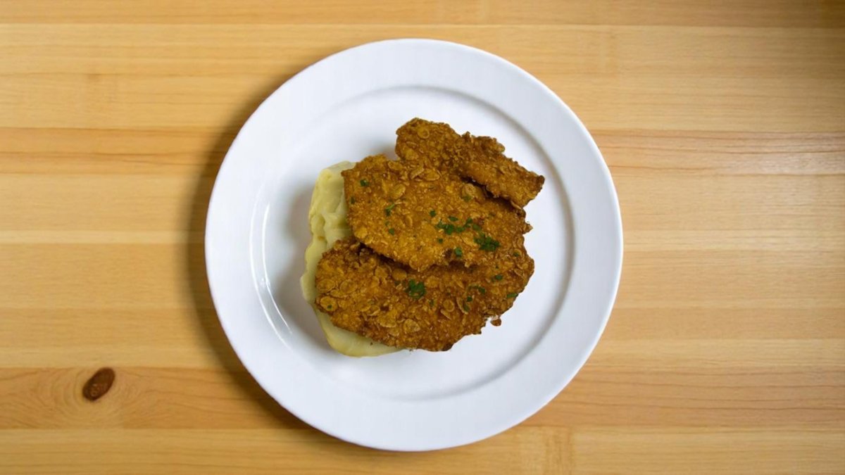 Juhtúróval, lilahagymával töltött csirkemell rántva