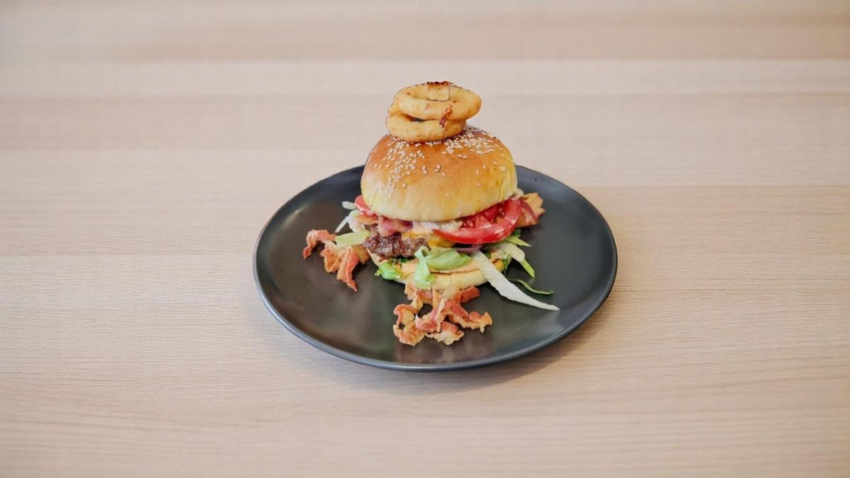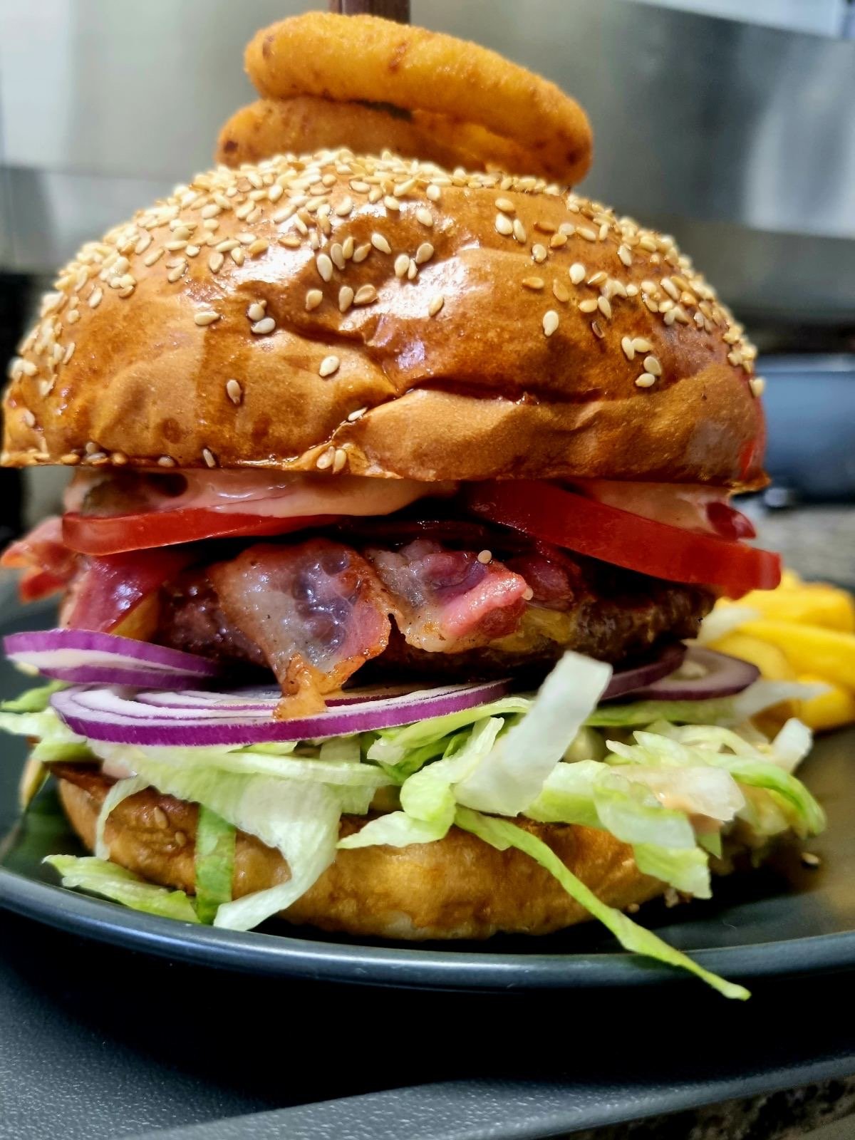 Szezámos Buci, cheddar sajt , házi szósz , paradicsom, lilahagyma , csemegeuborka, jég saláta , marhahús , hagyma karika , pirított bacon