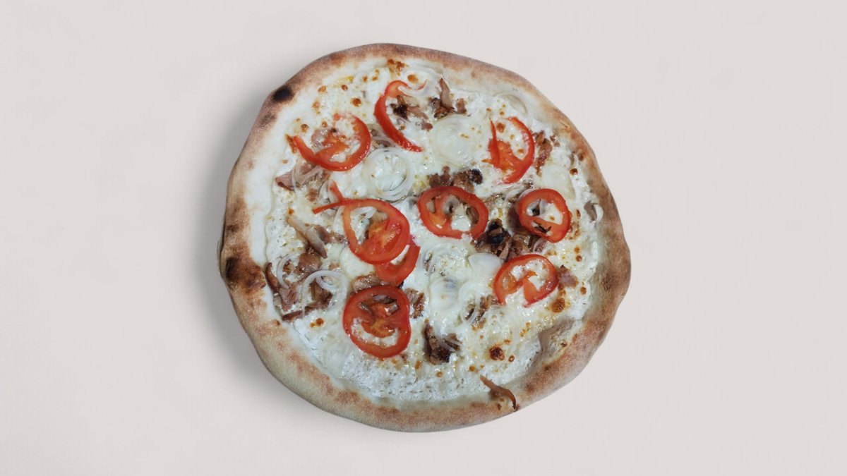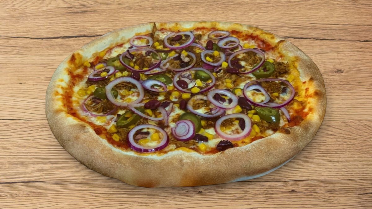 paradicsomszösz, mozzarella sajt, bab, kukorica, csirkemell, bacon, hagyma, csípős pepperoni
