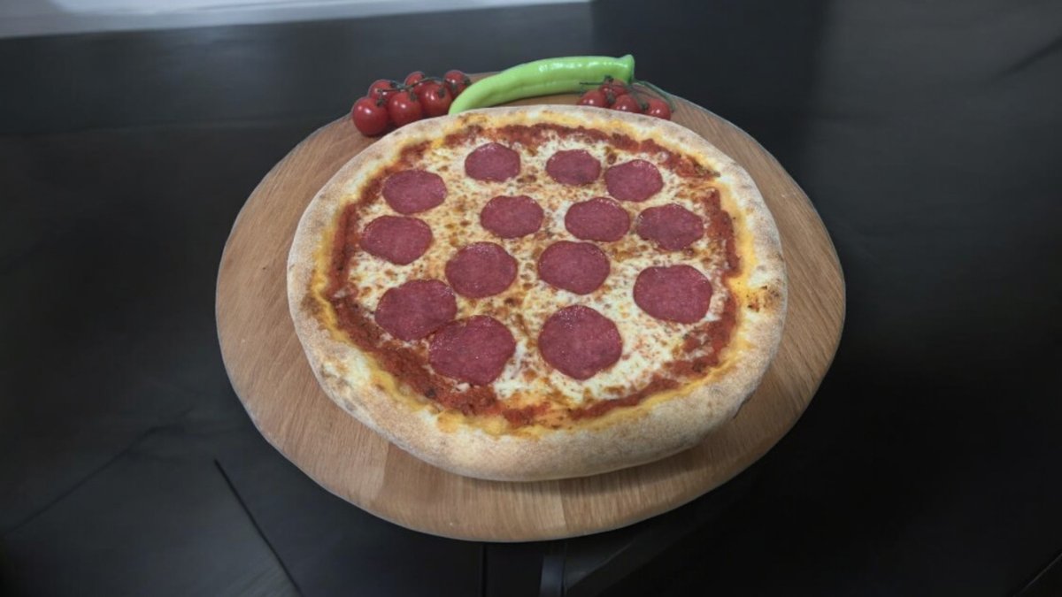 paradicsomos alap, mozzarella sajt, csípős szalámi, füstölt tarja, csípős pepperoni