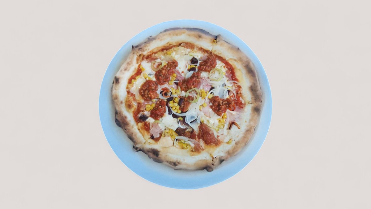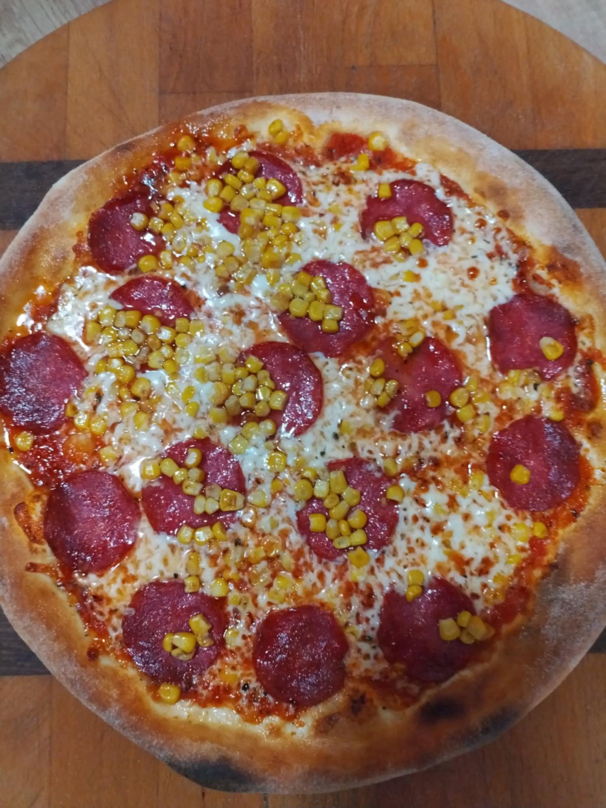 paradicsomszósz, mozzarella sajt, szalámi, kukorica