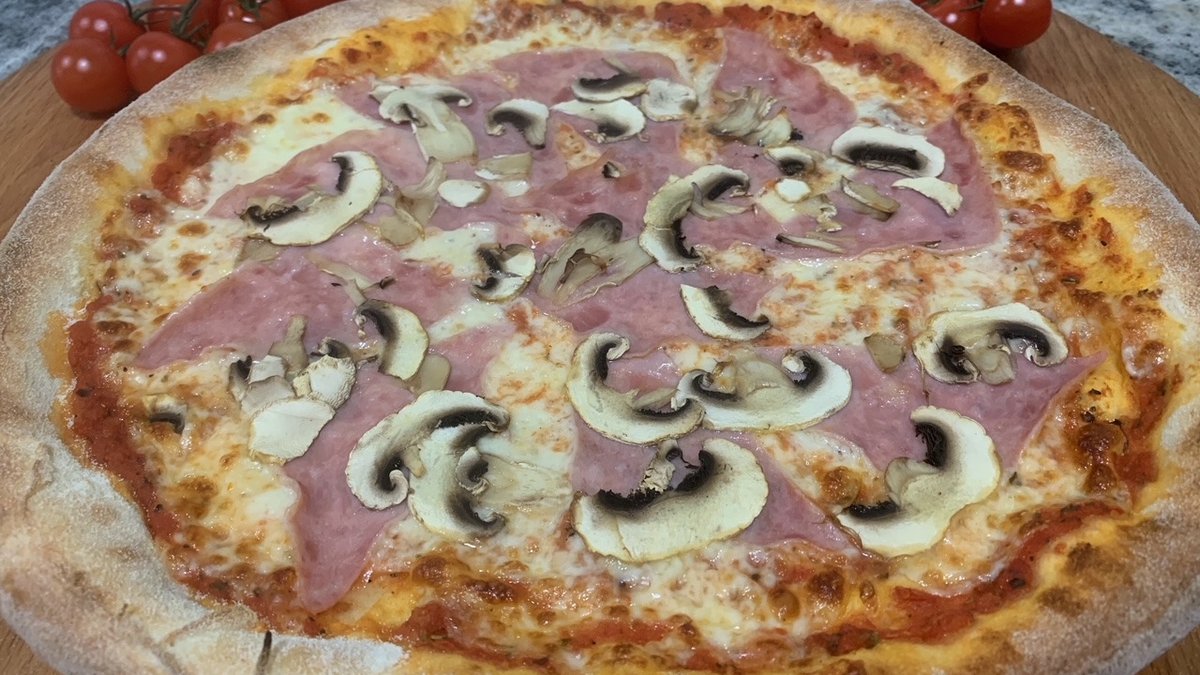 paradicsomszósz, mozzarella sajt, sonka, gomba