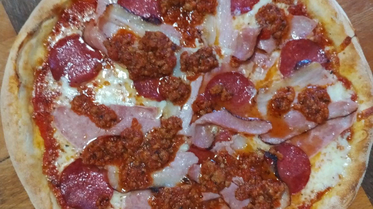 paradicsomszósz, mozzarella sajt, bolognai ragu, sonka, szalámi, bacon
