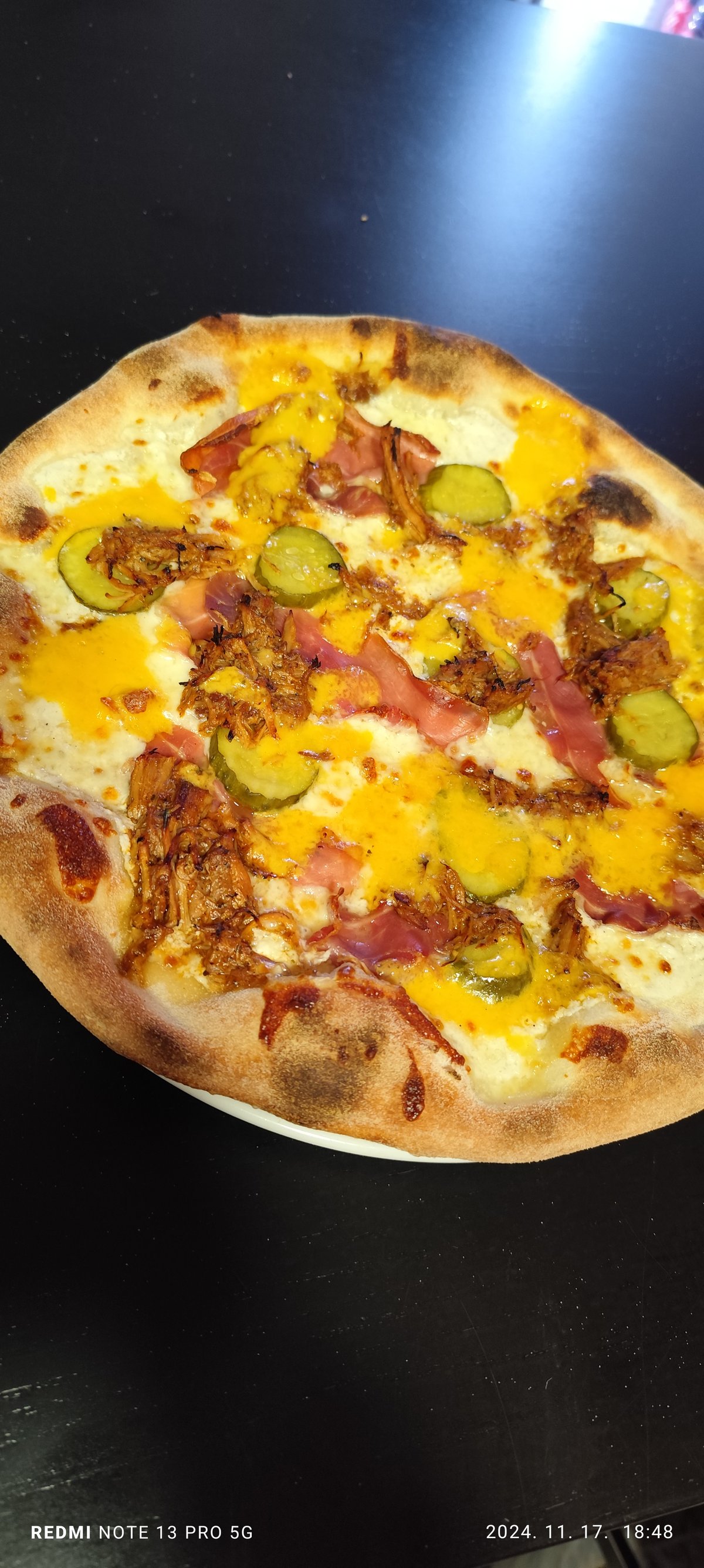 marhahús pogácsa, dupla cheddársajt, pirított bacon szalonna, saláta, paradicsomkarika, pulled pork hús, pampalini szósz