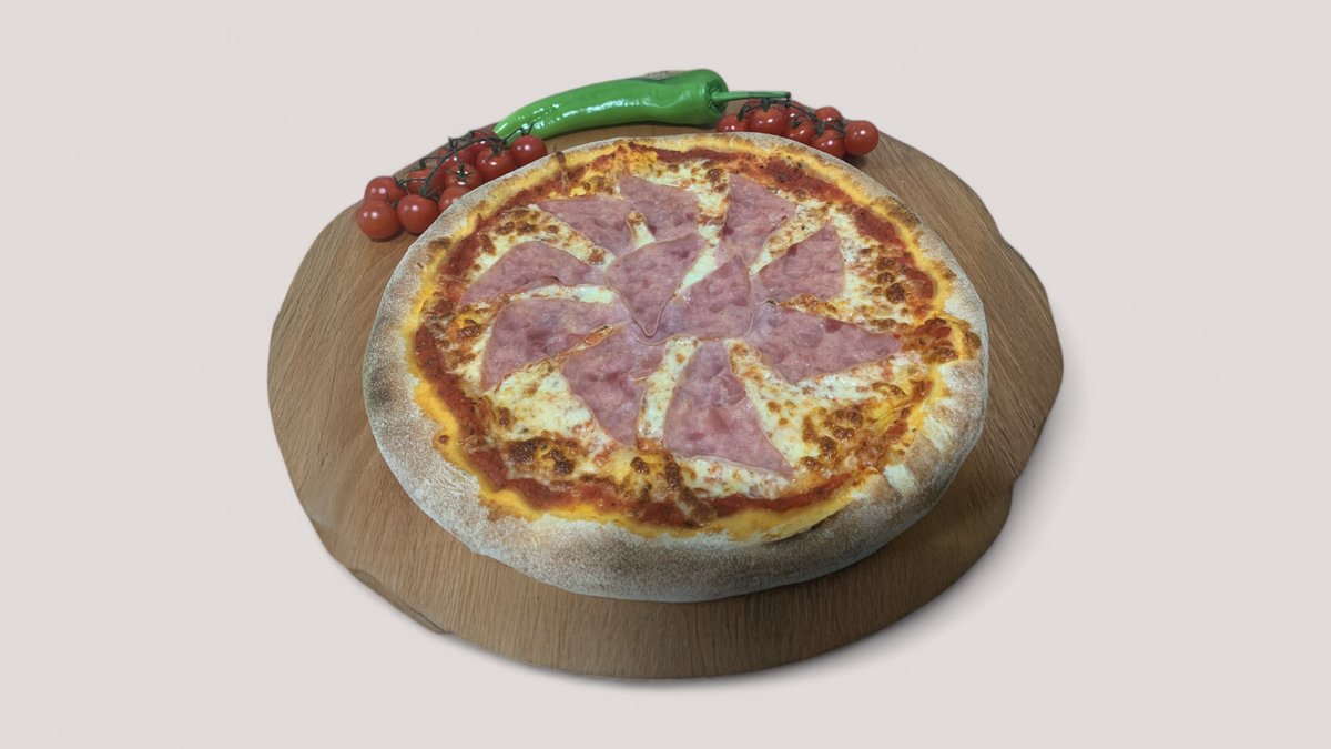 paradicsomos alap, mozzarella sajt, sonka, paradicsomkarika