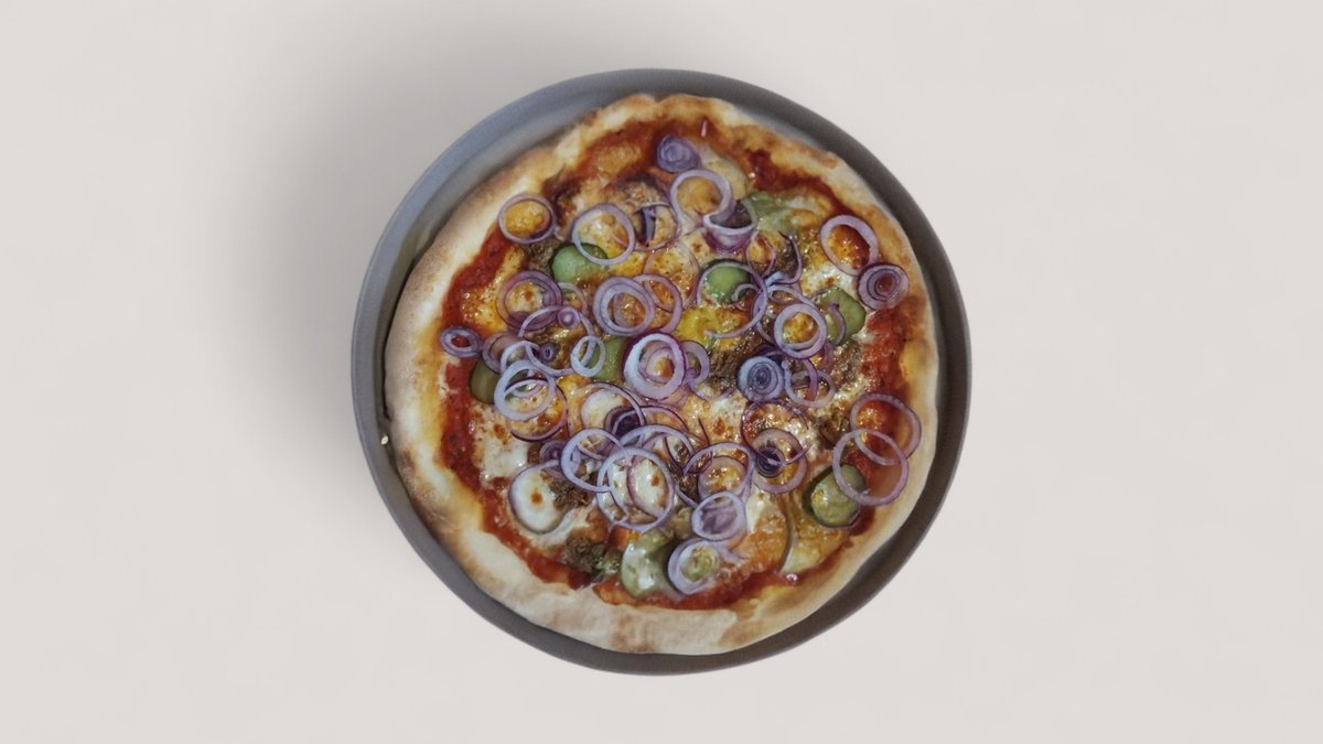 paradicsomszósz, mozzarella sajt, csípős szalámi, csípős pepperoni, lila hagyma