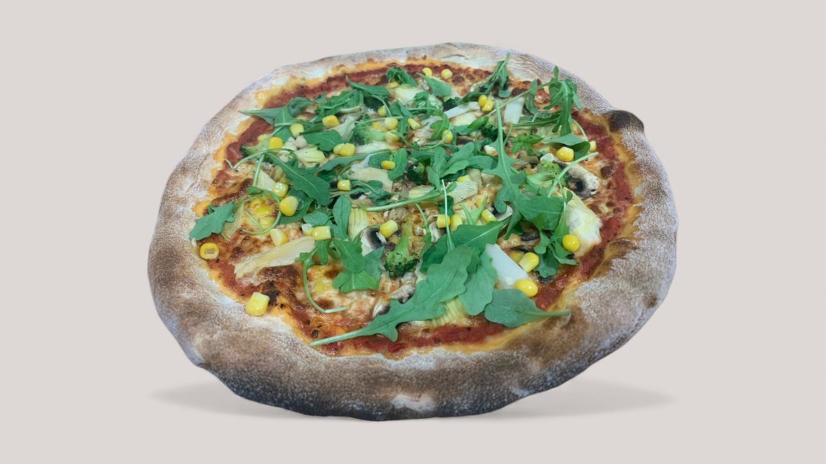 paradicsomszósz, mozzarella sajt, gomba, kukorica, brokkoli, rukkola