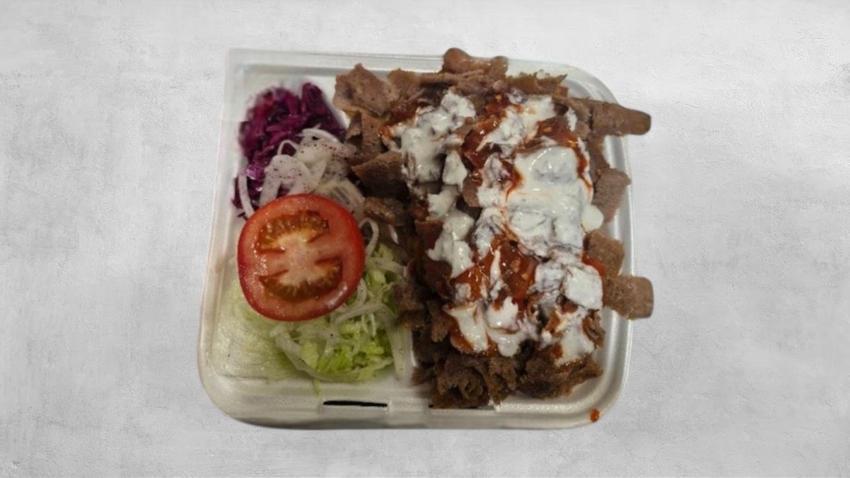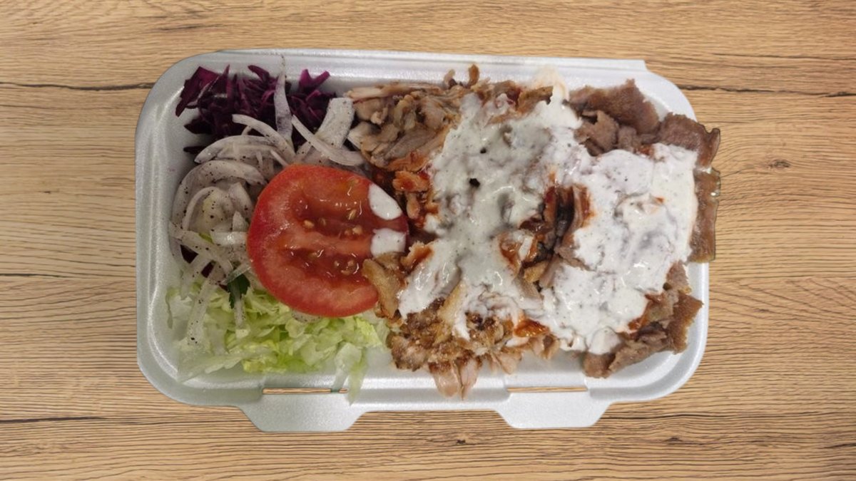 Jégsaláta, paradicsom, lilakáposzta, hagyma, gyros csirkehús, gyros marhahús, joghurt öntet, csípős szósz