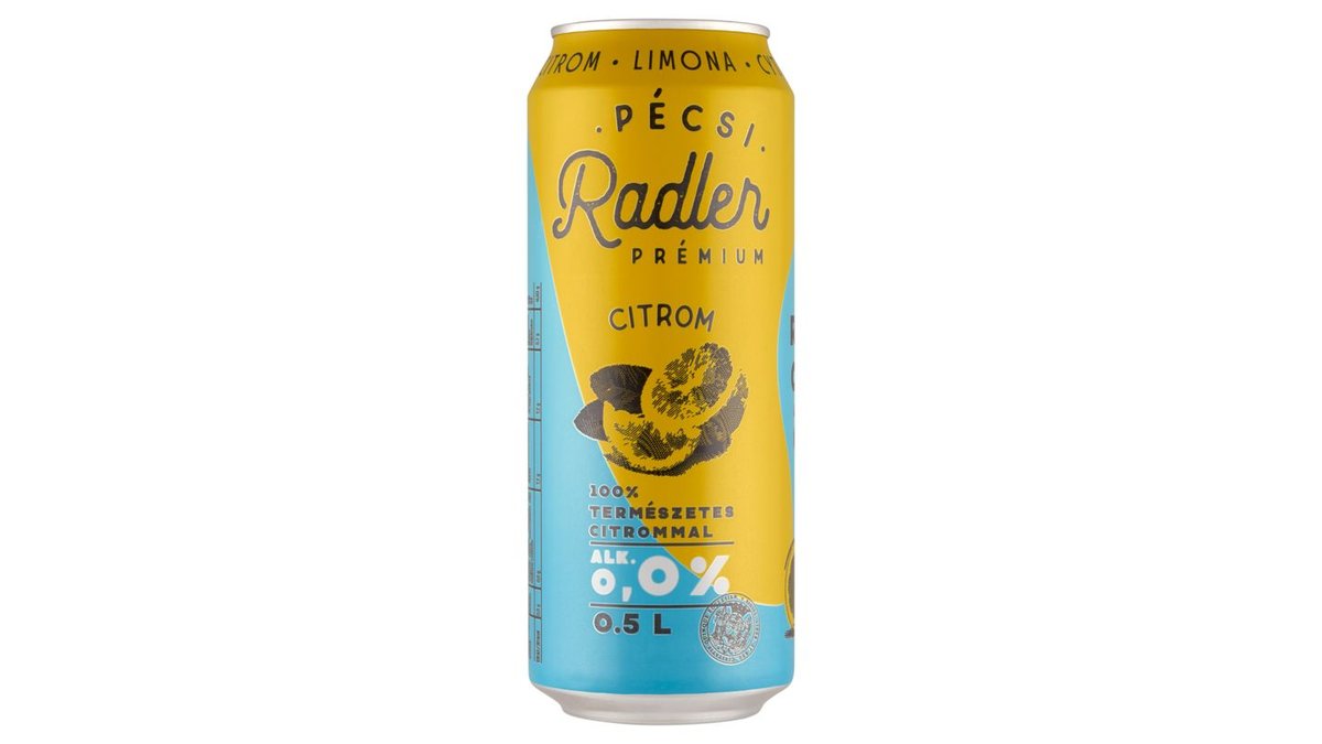 Pécsi Radler Prémium Citrom alkoholmentes világos sör & citrom ízű szénsavas üdítőital 0,0% 0,5 l