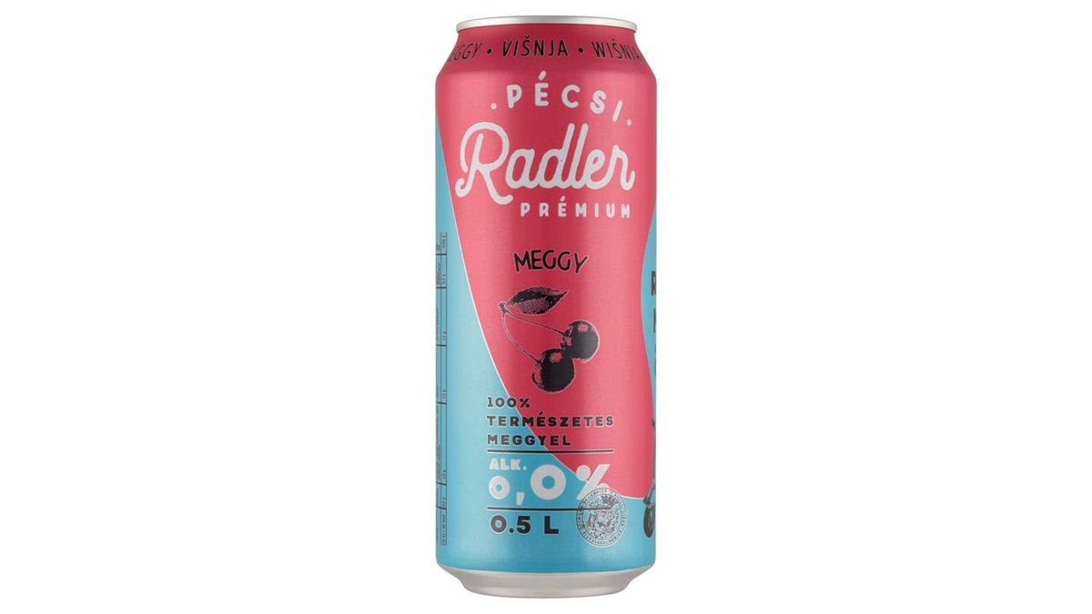 Pécsi Radler Prémium Meggy alkoholmentes világos sör és meggy ízű szénsavas üdítőital 0,0% 0,5 l