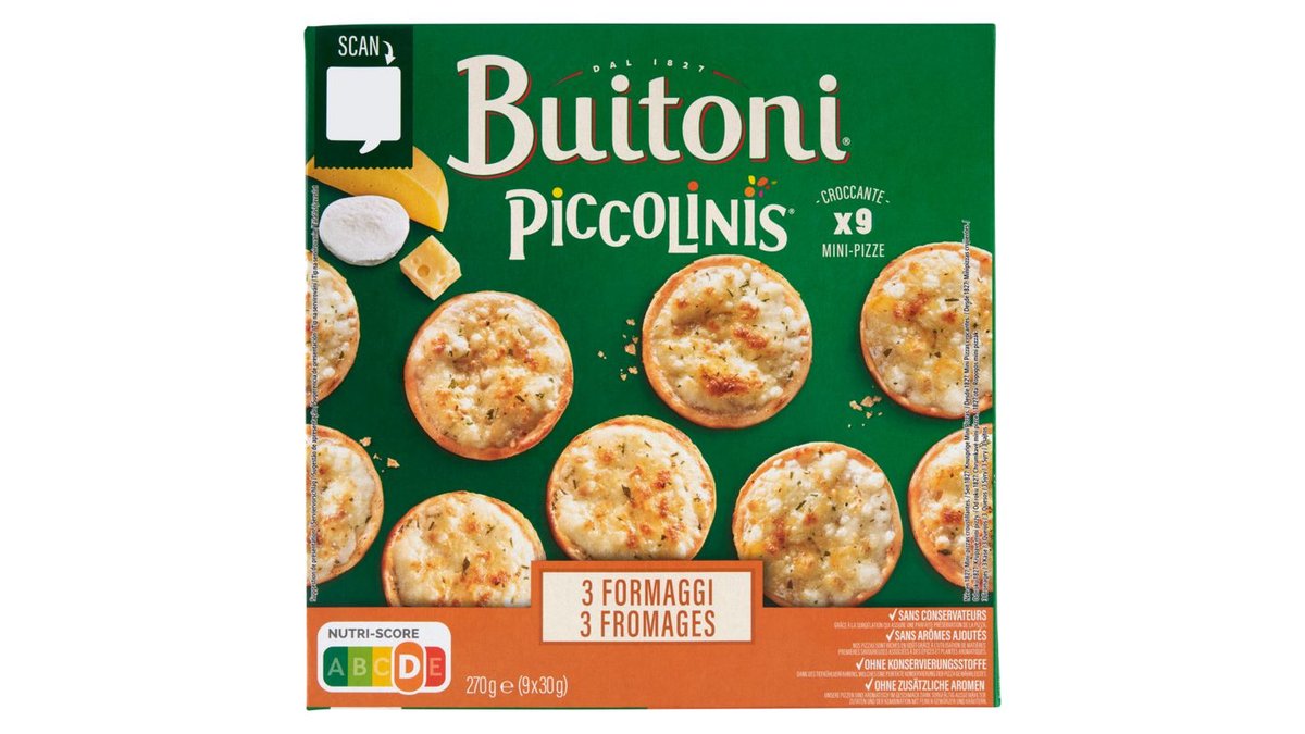 Buitoni Piccolinis gyorsfagyasztott pizza három féle sajttal 9 x 30 g (270 g)