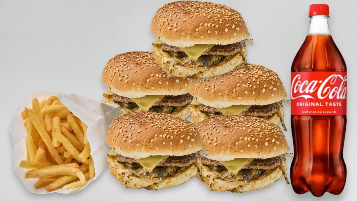 5 Ostborgarar, stór af frönskum og 2l gos