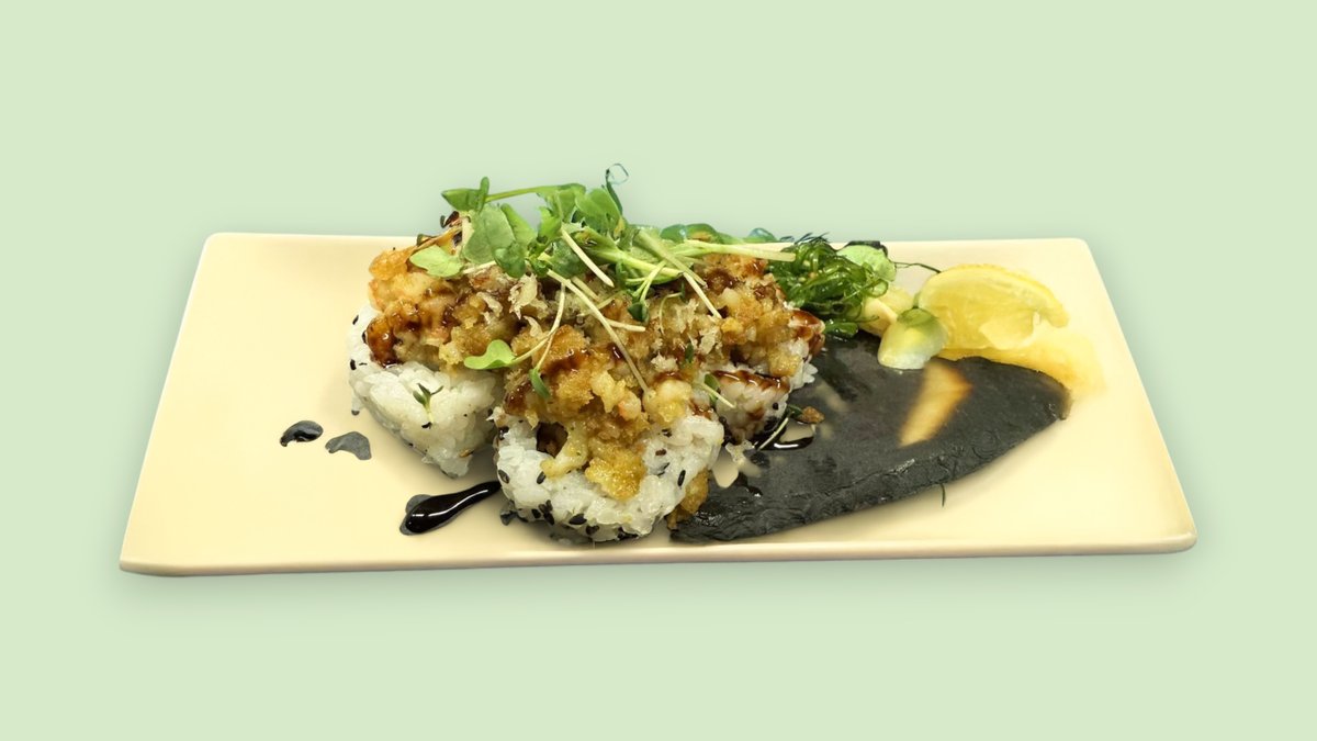 Hamachi, tempura rækja, lárpera, sriracha, mangó majó, stökkur blaðlaukur