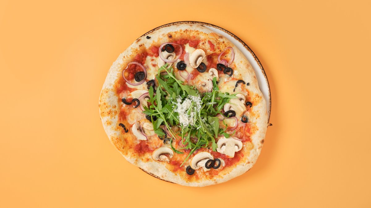 Tómatsósa, ferskur mozzarella, ólífur, sveppir, rauðlaukur og klettasalat.