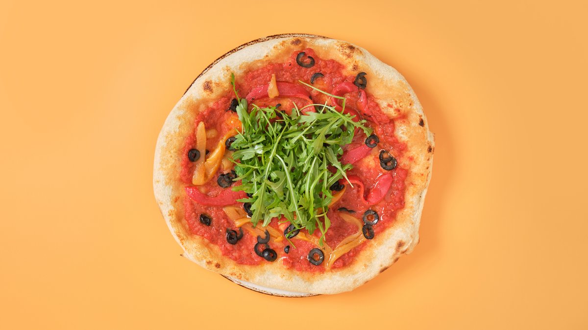 Tómatsósa, Kalamata ólífur, grilluð paprika, ólífuolía og klettasalat.