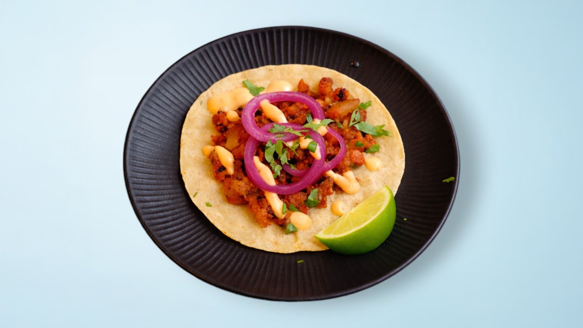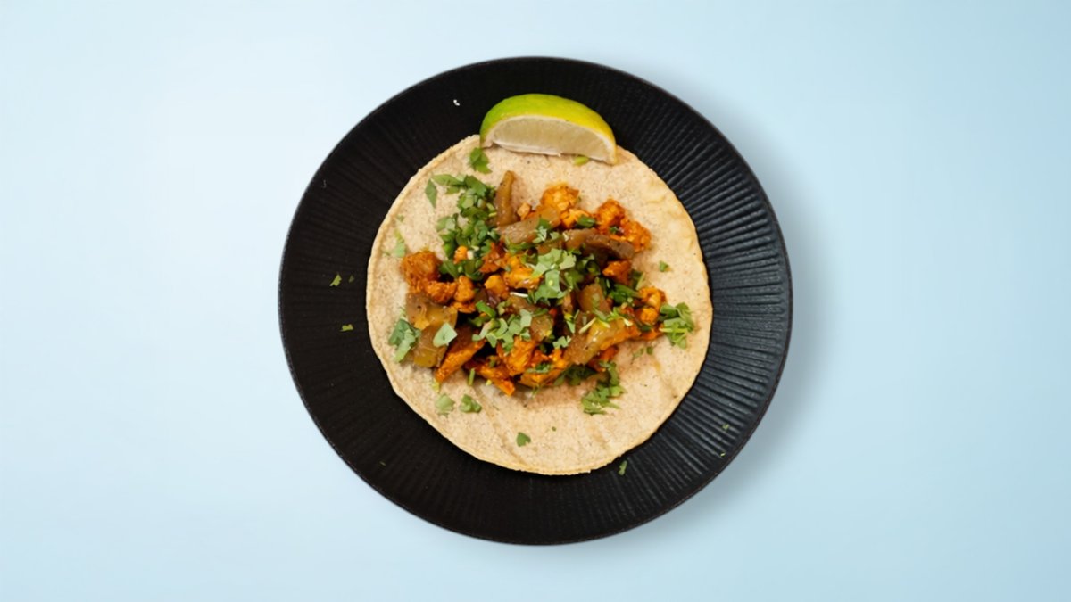 Tofumarinerað í chipotle adobo sósu, maístortillu með karamelliseruðum ananas, rauðlauk og kóríander. Viðmiðunarmynd