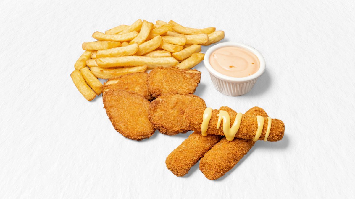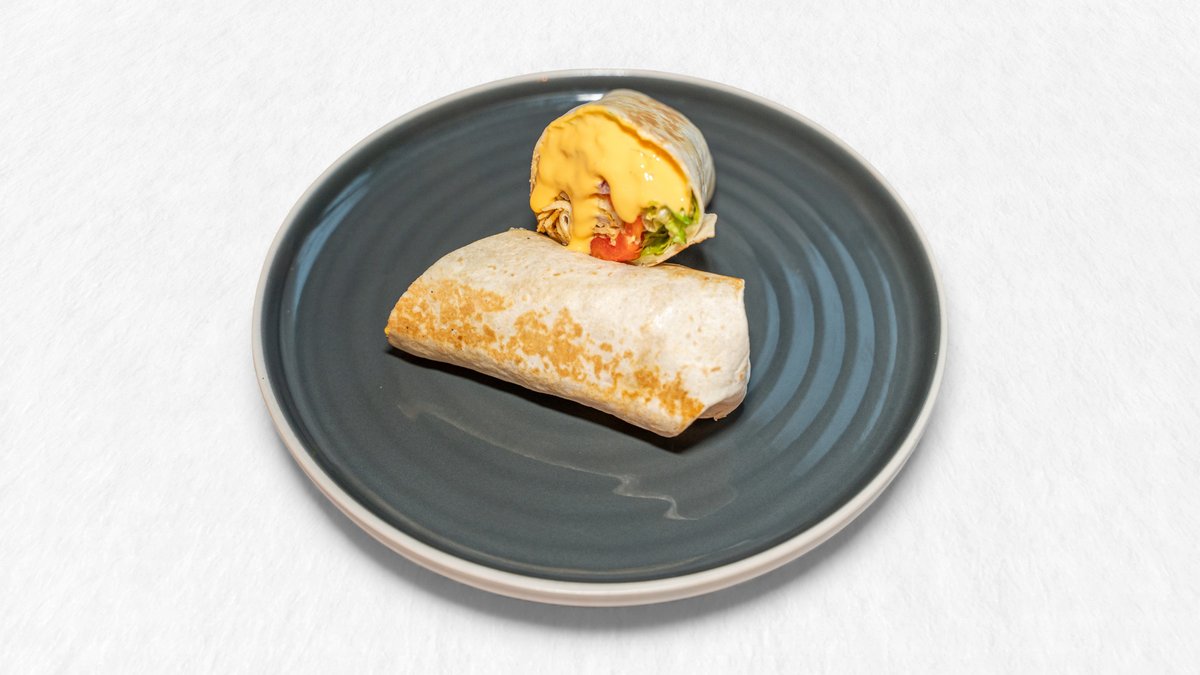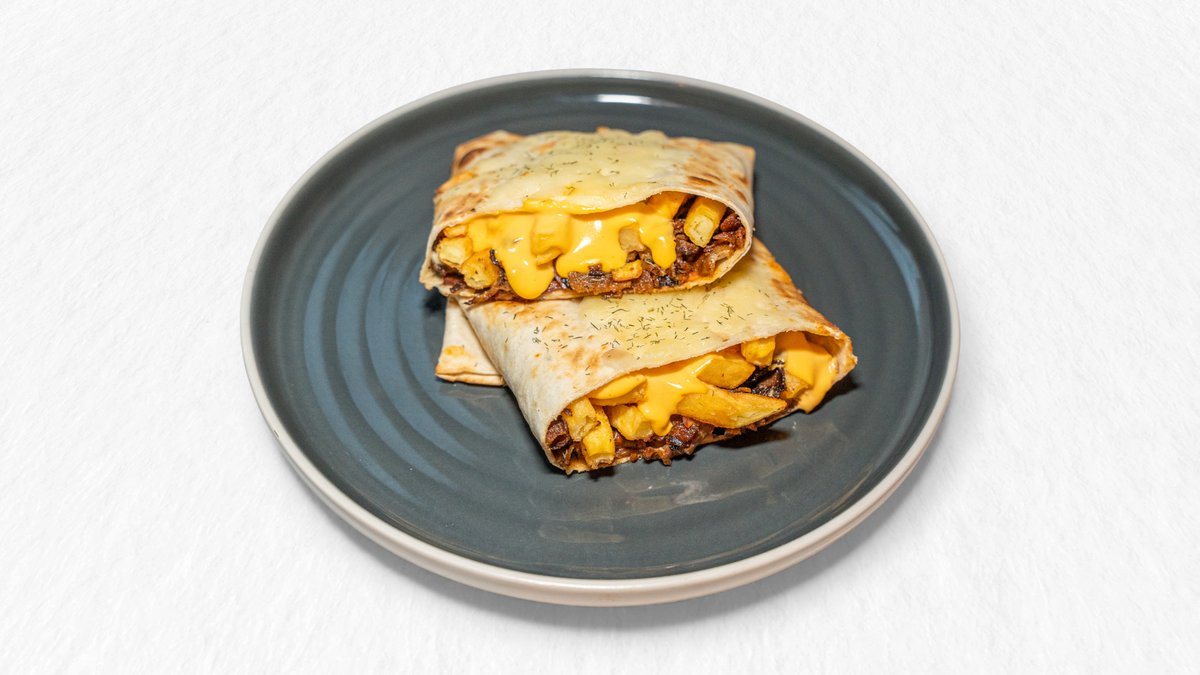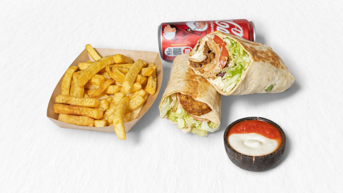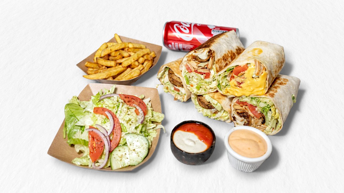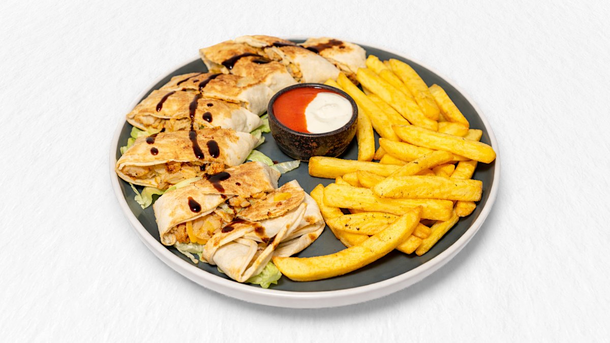 Tortillubrauð, ostur, franskar með granateplasósu, hvítlaukssósu, sterkri sósu. Hægt að breyta í máltíð sem inniheldur gos og franskar.