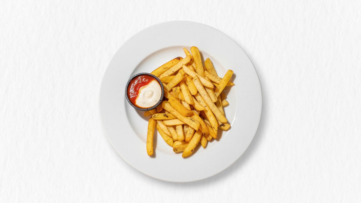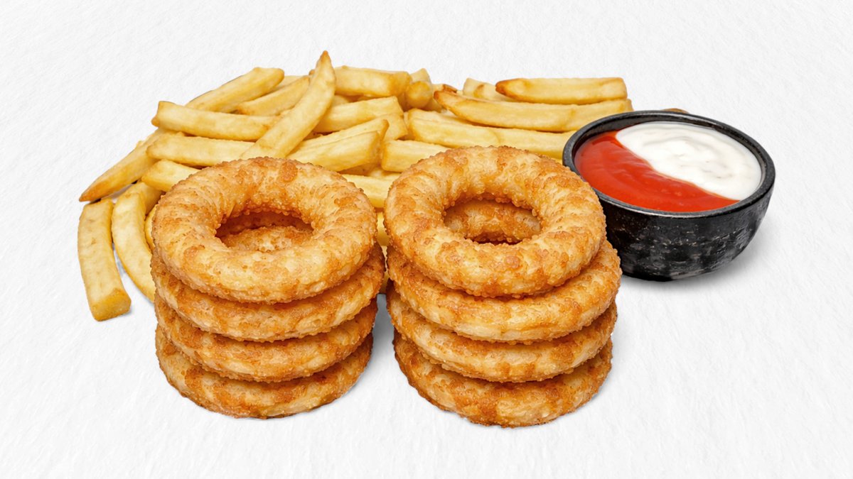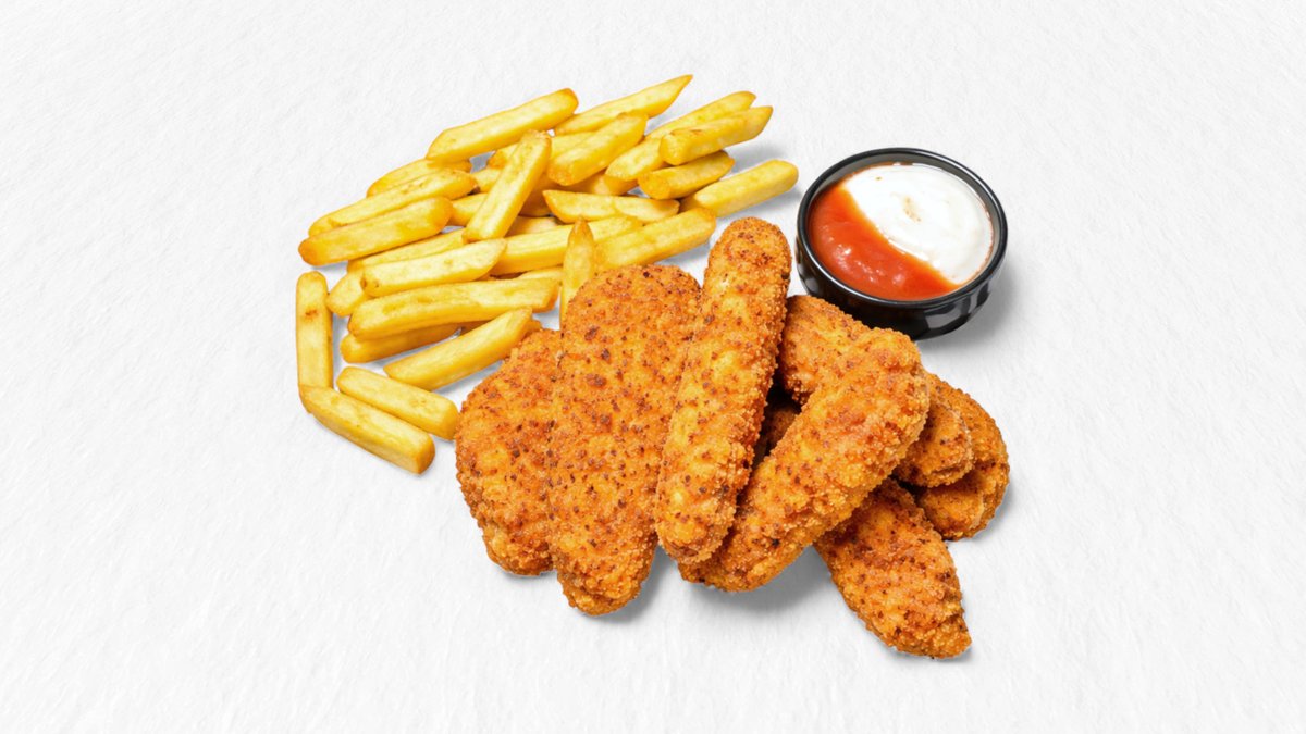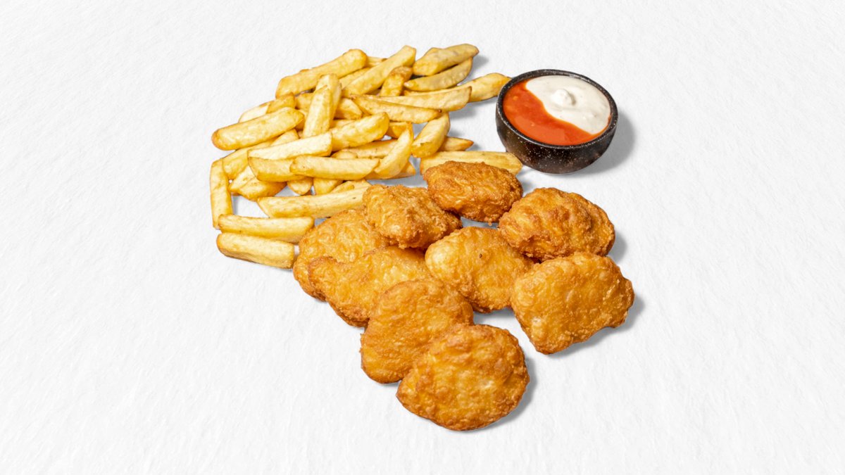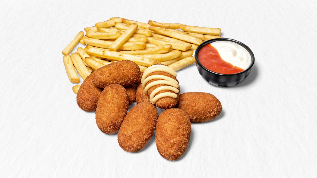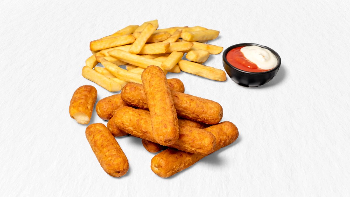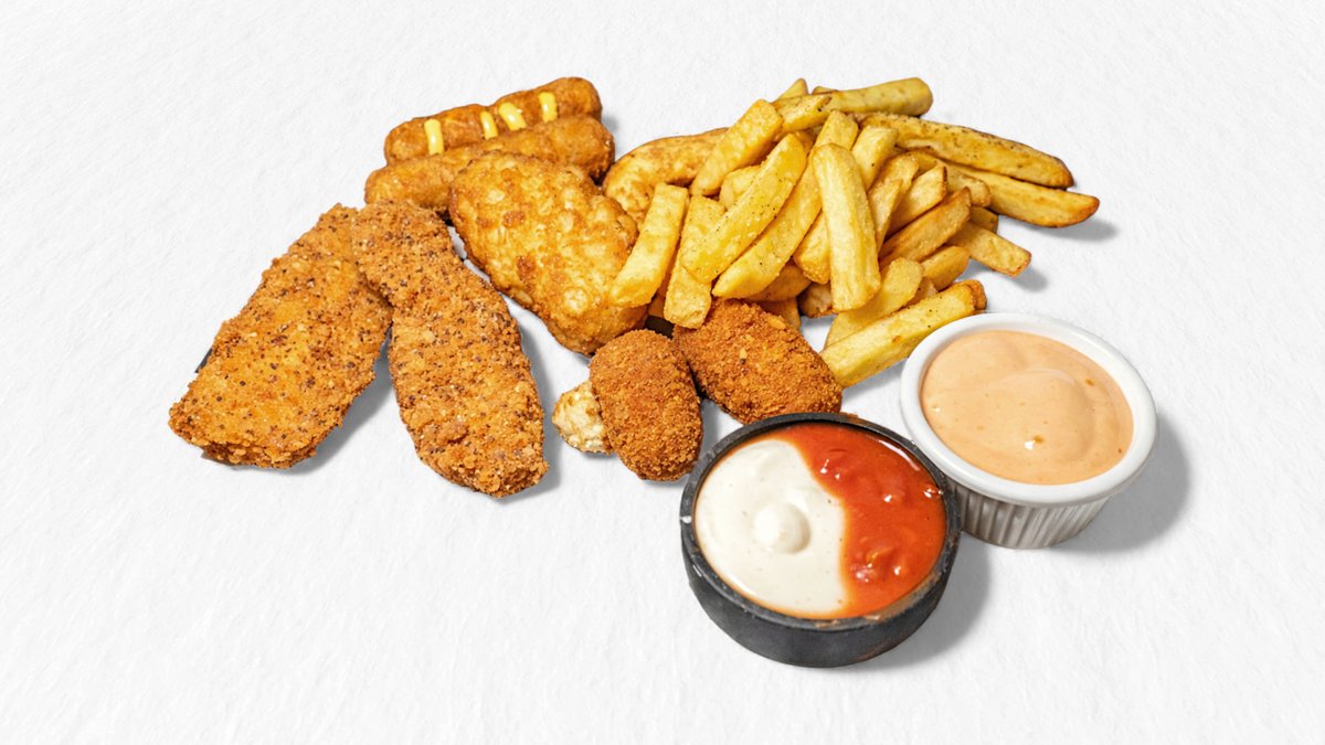 Tortillubrauð, ostur, franskar með granateplasósu, hvítlaukssósu, sterkri sósu. Hægt að breyta í máltíð sem inniheldur gos og franskar.