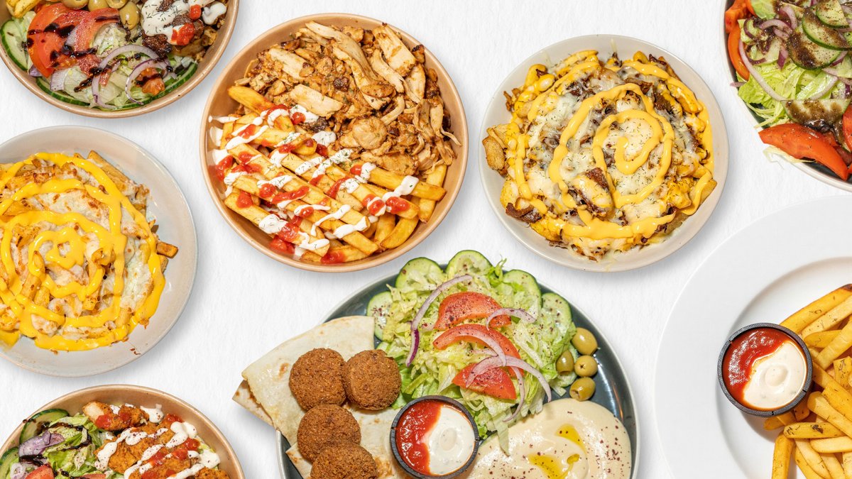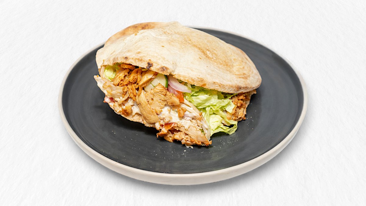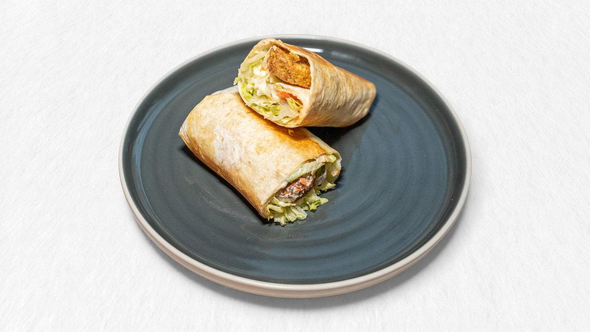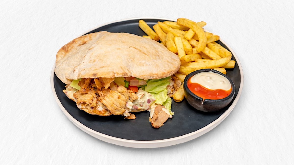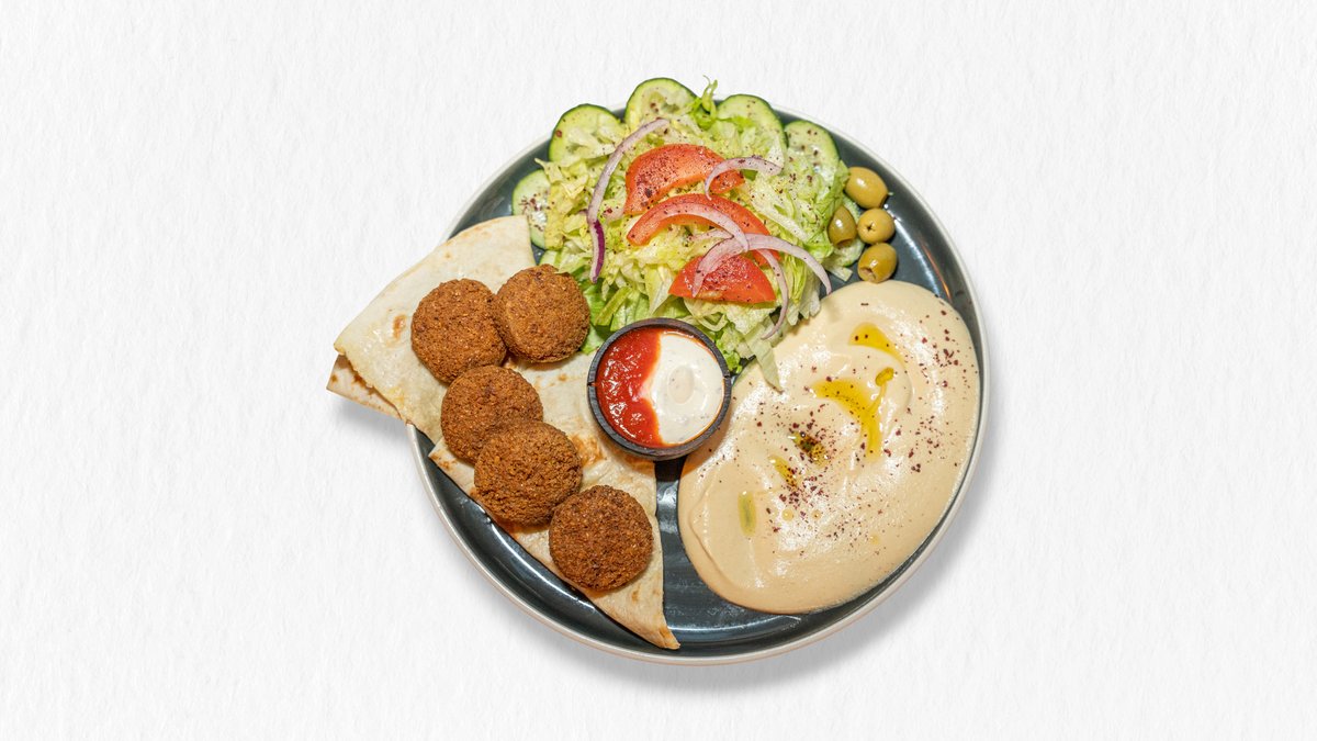 Hummus, brauð, salat, tómatar, gúrka, rauðlaukur, hvítlaukssósa, sterk sósa. Hægt að breyta í máltíð sem inniheldur gos og franskar.