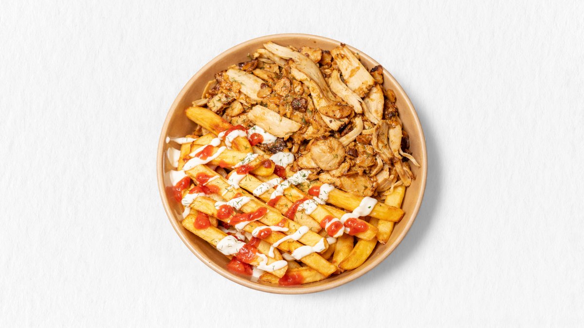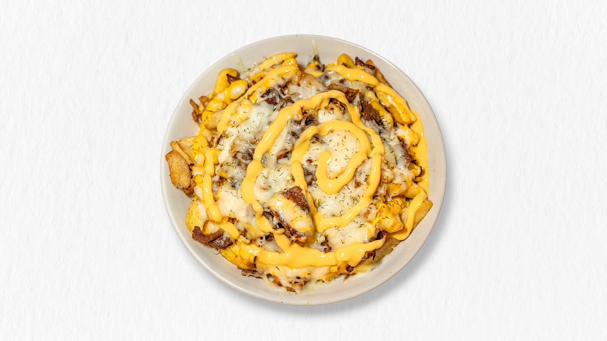 Franskar, kjöt, ostur, ostasósa, hvítlaukssósa, sterk sósa. Hægt að breyta í máltíð sem inniheldur gos og franskar.