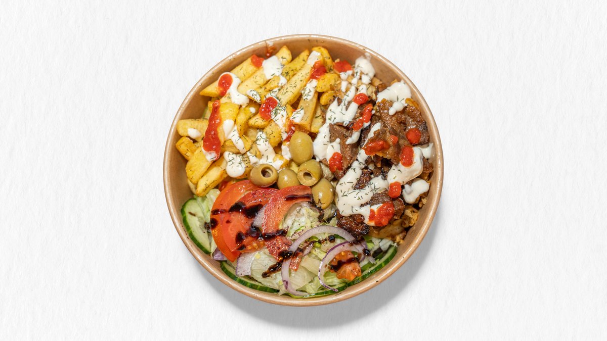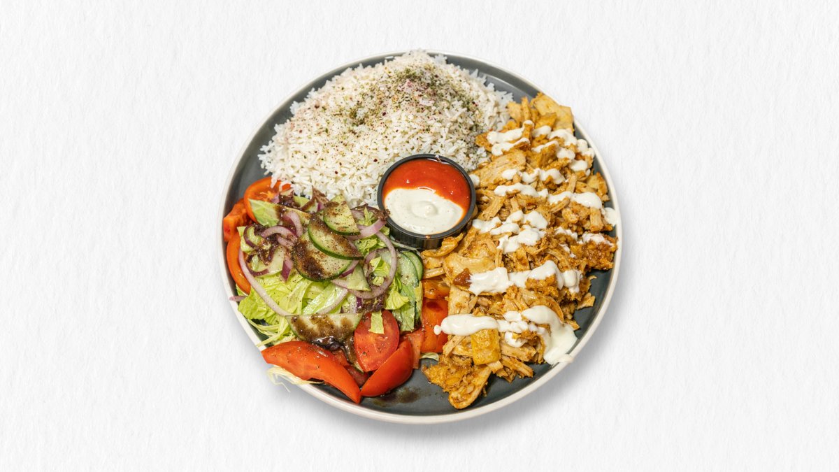 Hrísgrjón eða franskar, kjöt, salat, tómatar, gúrka, rauðlaukur, hvítlaukssósa, sterk sósa. Hægt að breyta í máltíð sem inniheldur gos og franskar.