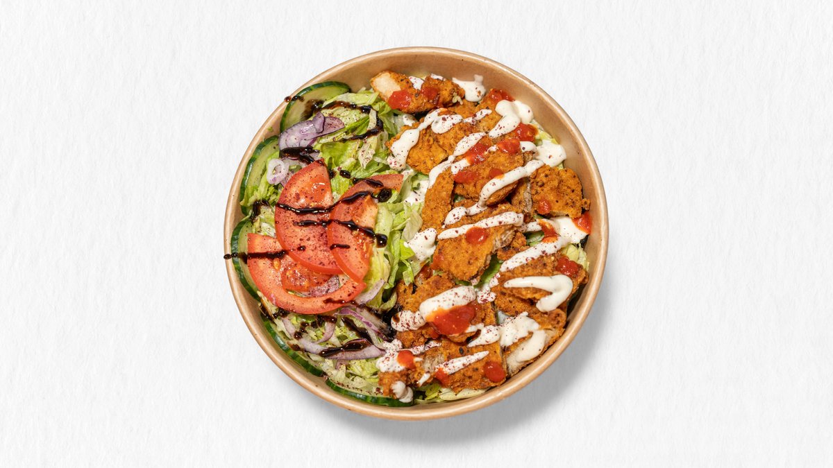 Salat, tómatar, gúrka, rauðlaukur Hvítlaukssósa, sterk sósa, mozzarella. Hægt að breyta í máltíð sem inniheldur gos og franskar.