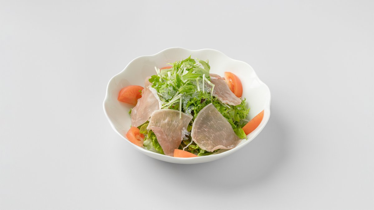 ミックスサラダに生ハムとトマトをイタリアンドレッシングでお楽しみください。