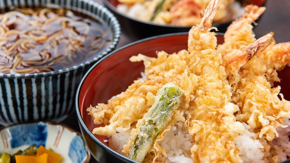 1番人気のえび天丼と温かいおそばのセットです。そばの容器は透明なフタ以外はレンジアップ可能なものを使っております。